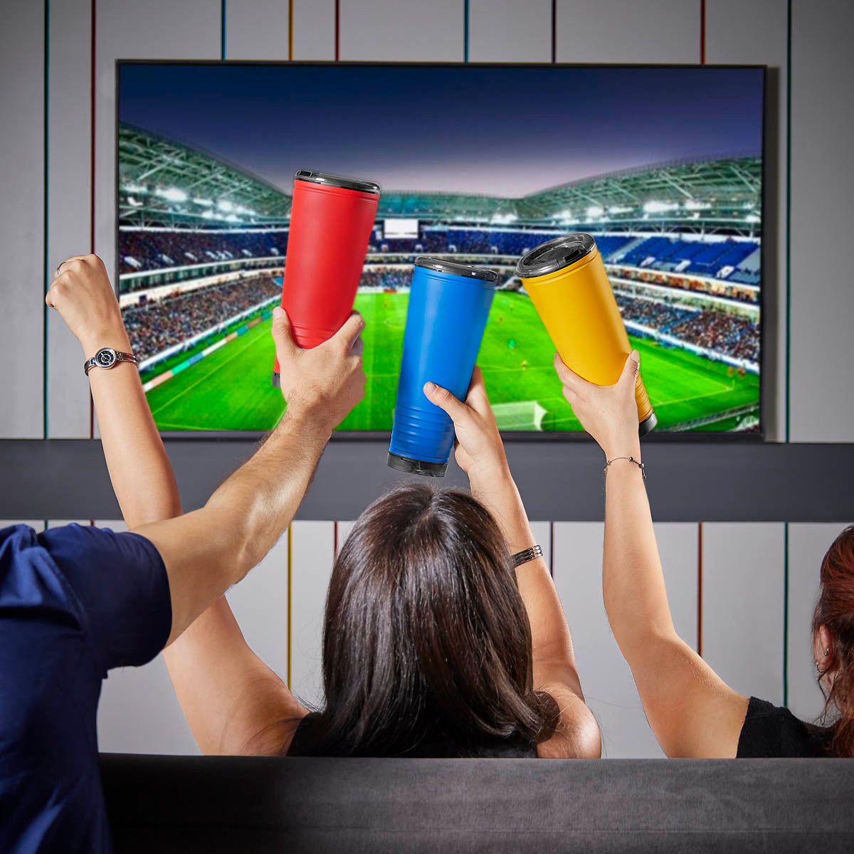 ¡lleva la emoción de los eventos deportivos al siguiente nivel! termo equipado con una boquilla especial en la tapa que realiza una doble función; como trompeta, para animar tu evento favorito y al mismo tiempo, disfrutar de tu bebida preferida. termo doble pared. pared interna de plástico y externa de acero inoxidable. tapa de plástico con sistema push y válvula de seguridad. capacidad de 24 oz. base de 7 cm de diámetro. incluye caja individual.