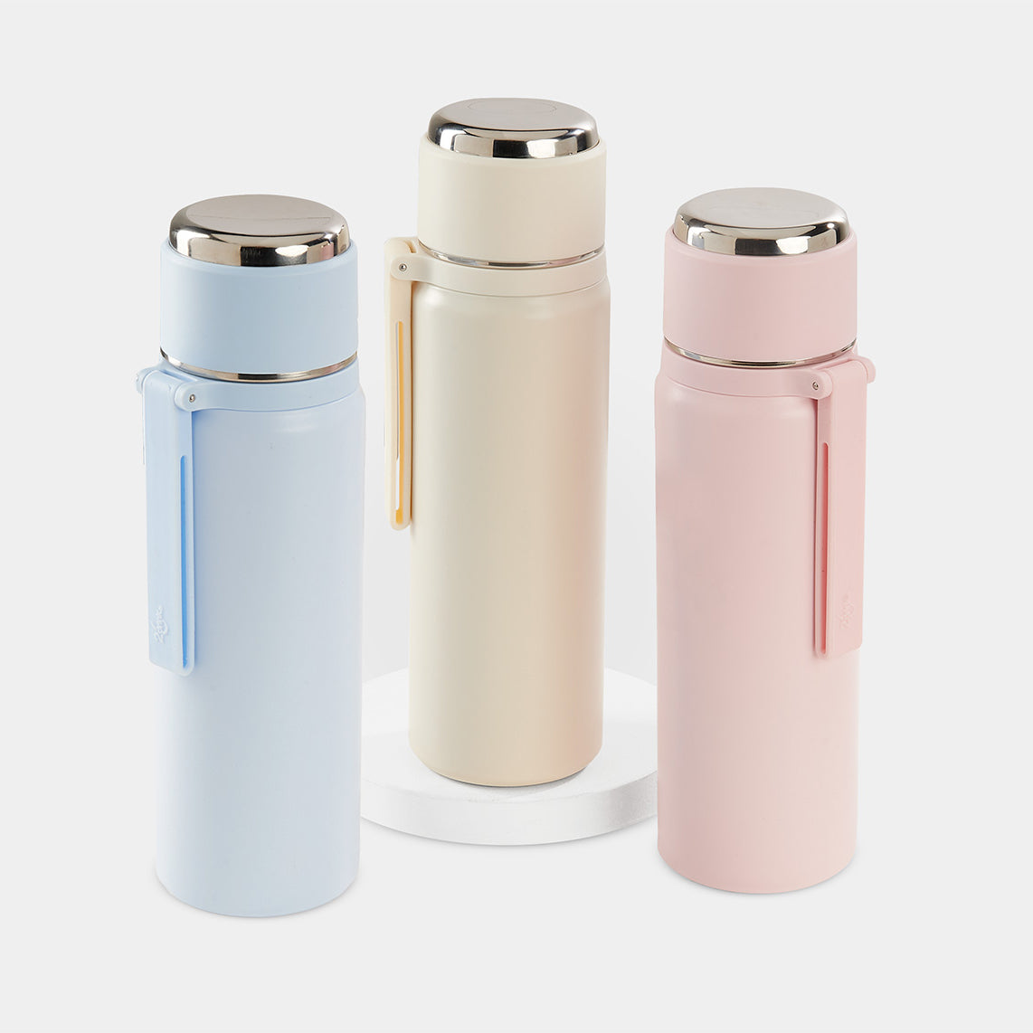 termo doble pared. cerrado al vacío. pared interna y externa acero inoxidable. tapa de plástico con sistema de rosca, boquilla y botón de seguridad para mantener cerrado y sin derrames, incluye sobretapa metálica de rosca. cuenta con un asa de silicón para llevarlo fácilmente a donde quiera que vayas. mantiene la temperatura caliente por 12 hrs y la temperatura fría por 24 hrs. capacidad de 17 oz. incluye caja individual.