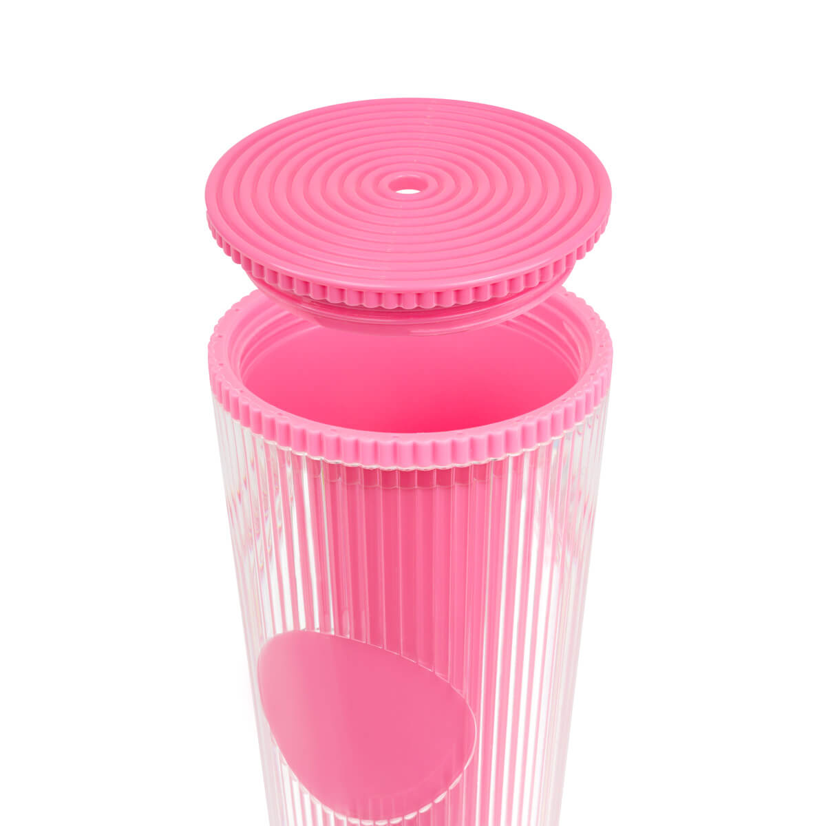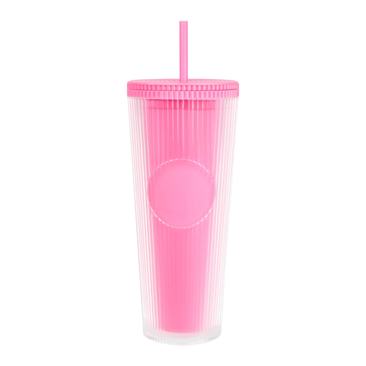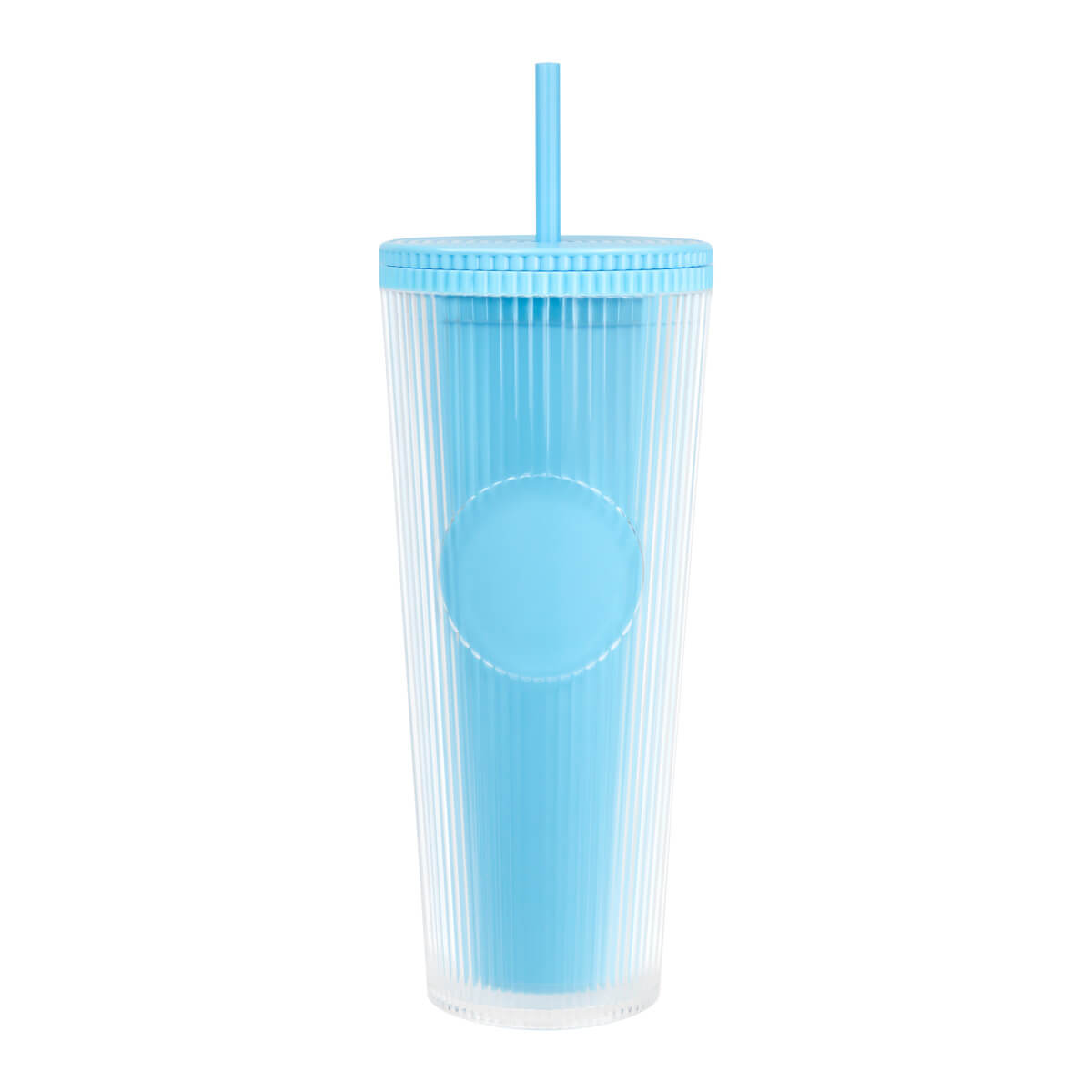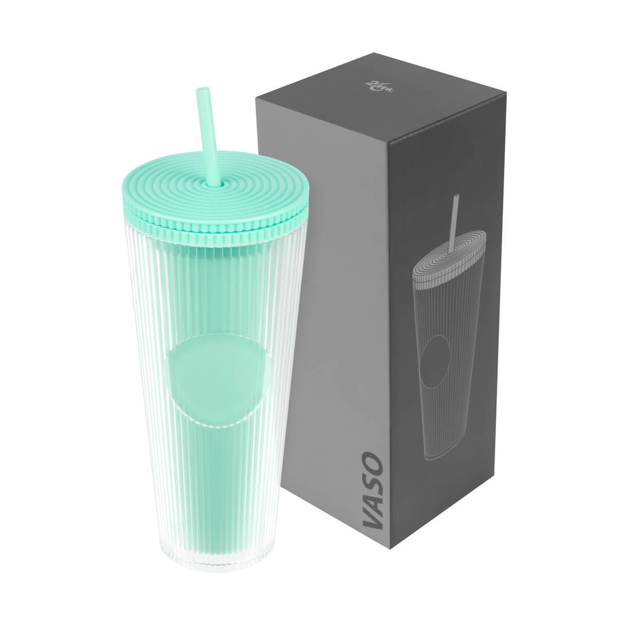 vaso doble pared. pared interna y externa de plástico. tapa de rosca y ranura para popote. diseñado moderno de acabado texturizado, con líneas en relieve le dan un toque único y moderno. ideal para oficina, escuela o para disfrutar de tus bebidas mientras viajas. capacidad de 24 oz. base de 7 cm de diámetro. incluye popote de plástico y caja individual.