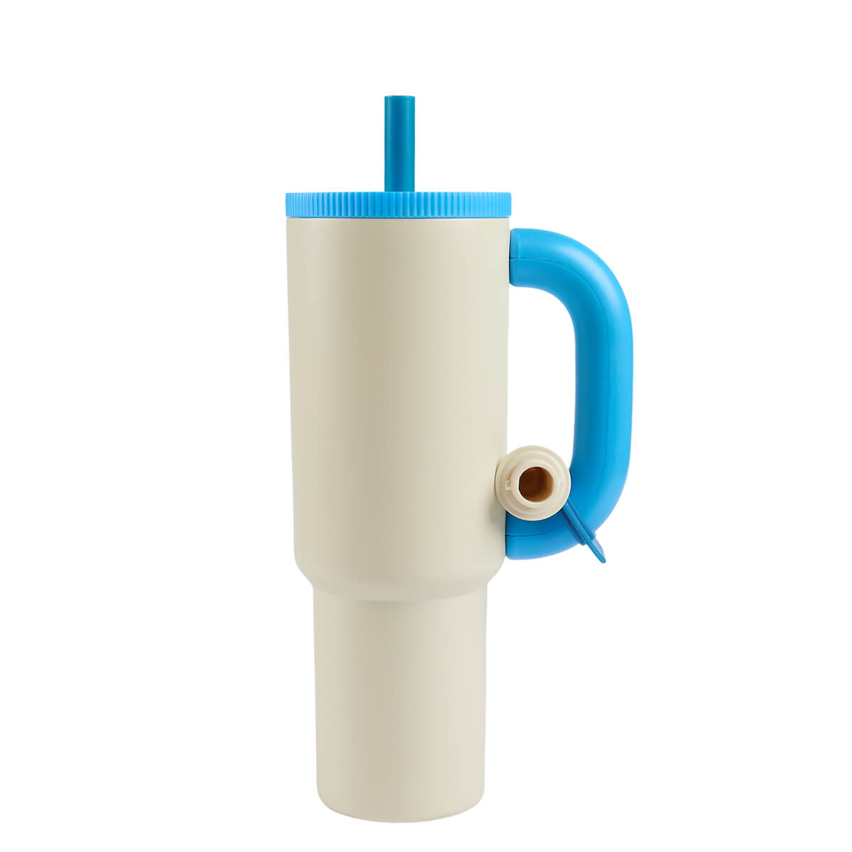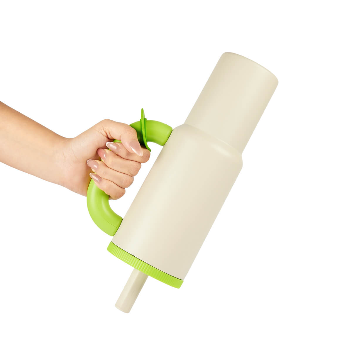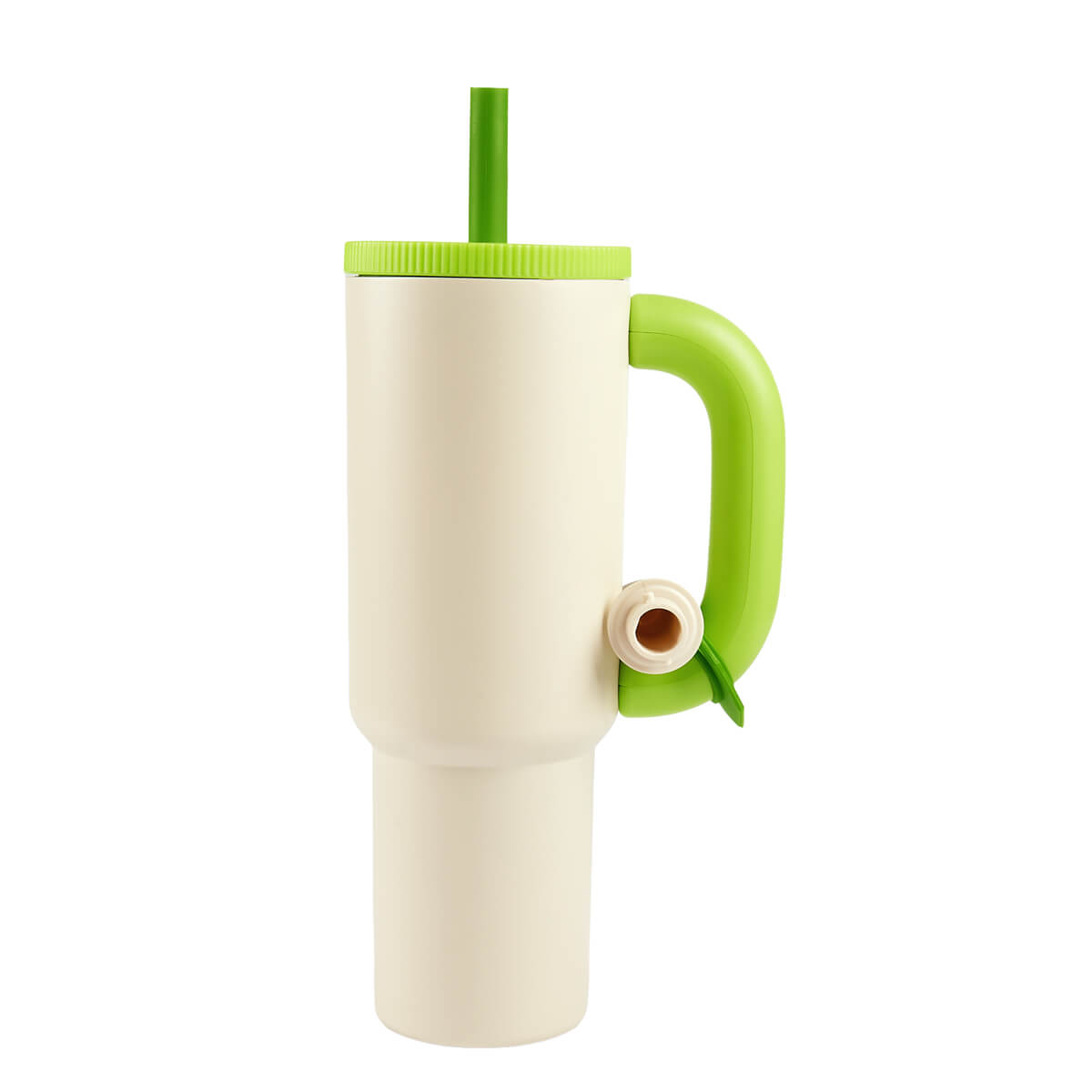 termo doble pared . cerrado al vacío. pared interna y externa de acero inoxidable. terminado en texturizado rugoso que le brinda un toque moderno y original. incluye tapa de plástico con sistema de rosca y popote más ancho, ideal para bebidas como frappes o licuados. su asa extra grande le permite un agarre más cómodo y seguro. además, cuenta con un tapón y un sistema de rosca que se integra de manera práctica al aditamento de silicón, evitando que se extravíe. ideal para llevar a todas partes con un look moderno y diferente. mantiene bebidas calientes por 6 hrs y frías hasta 12 hrs. capacidad de 40 oz. base de 8.3 cm de diámetro. incluye caja individual.