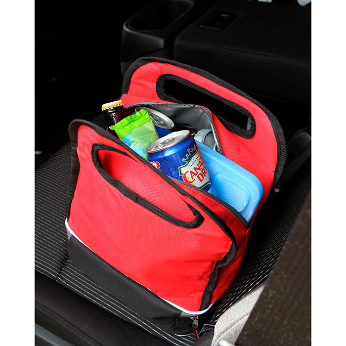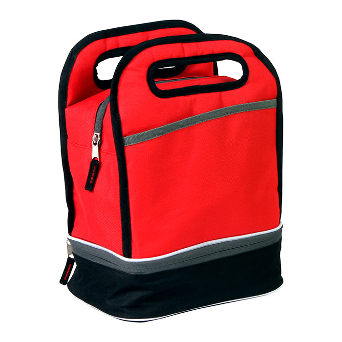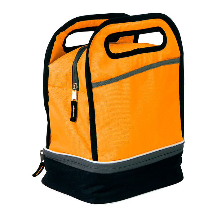 lonchera fabricada en poliéster 600d con forro de peva y compartimento doble, asas en la parte superior, con detalles en color gris y negro, que le añaden un toque de personalidad y estilo.