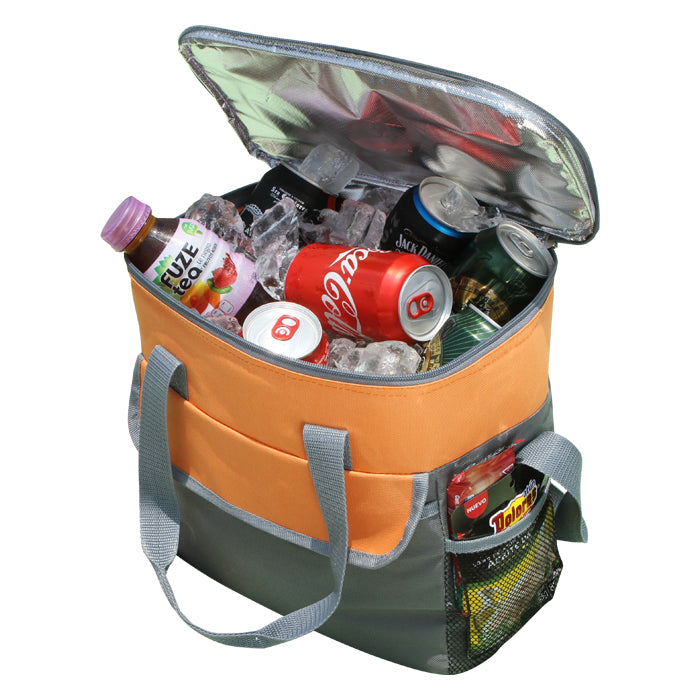 hielera fabricada en poliéster 600d con forro de pvc y aluminio, compartimento frontal con bolsas laterales de malla, asas superiores y correa para hombro, capacidad para 16 latas .