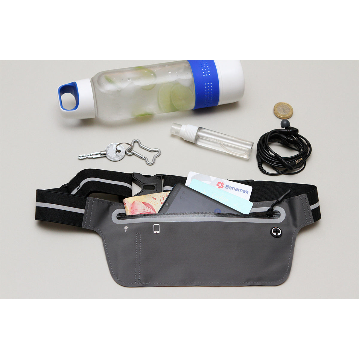 cangurera / riñonera deportiva ajustable, resistente al agua, compartimento para llaves y con salida para audífonos (no incluidos). diseño delgado y con gran capacidad y funcionalidad.