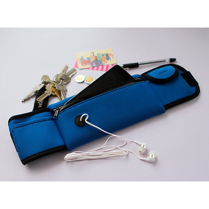 cinturón deportivo ajustable con salida para audífonos, bolsa frontal con cierre y compartimientos laterales. fabricado en neopreno. se puede usar en diversas ocasiones.