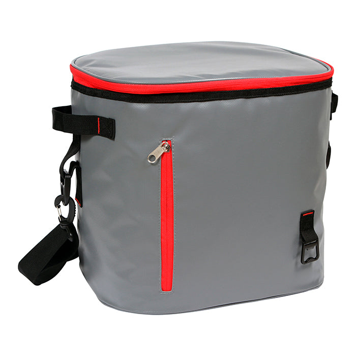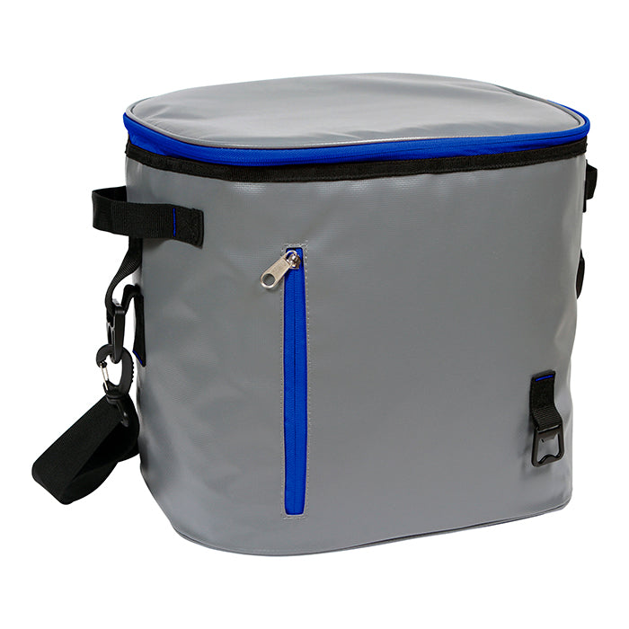 hielera fabricada en pvc (lona) con destapador y compartimiento en el lado frontal, con correa ajustable y retirable, con asas en los costados para mayor comodidad al momento de transportar, cuenta con detalles de color en los cierres.