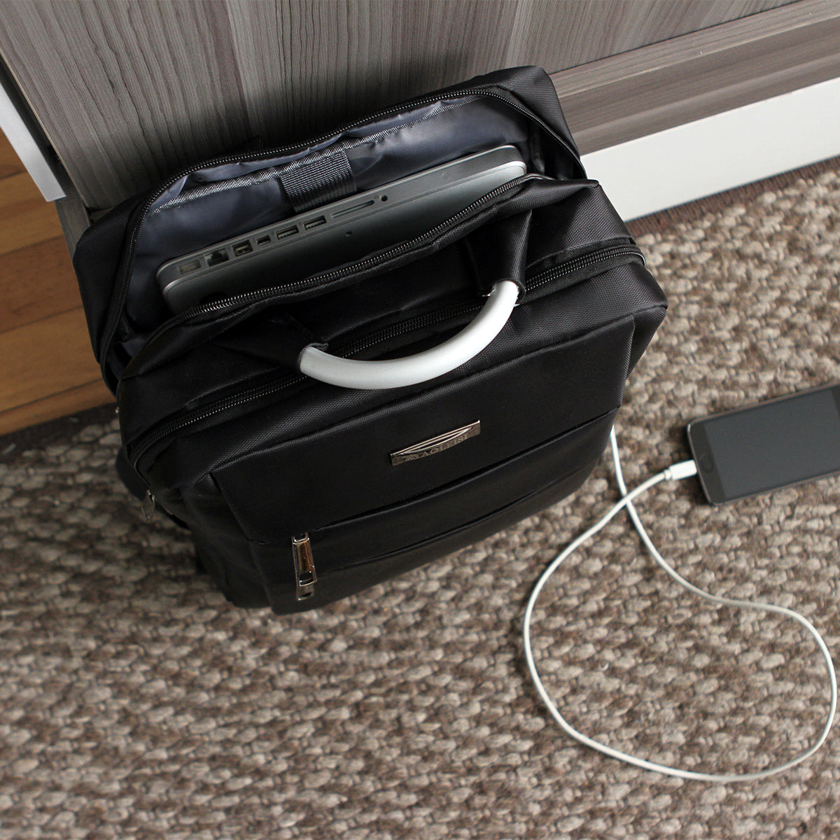 mochila fabricada en poliéster con porta laptop, cable con puerto usb, múltiples compartimentos, cierres al frente, asa metálica y placa de metal al frente.