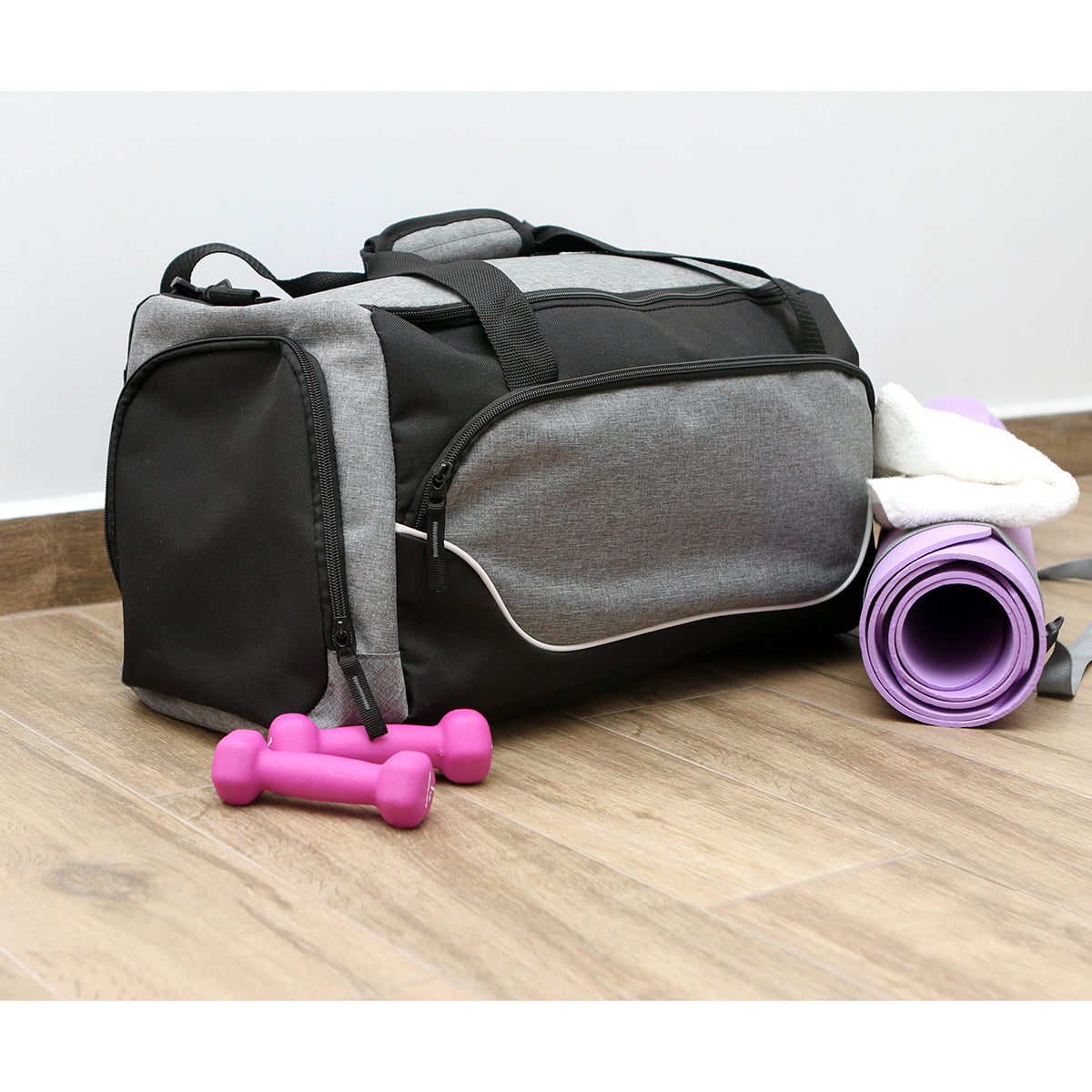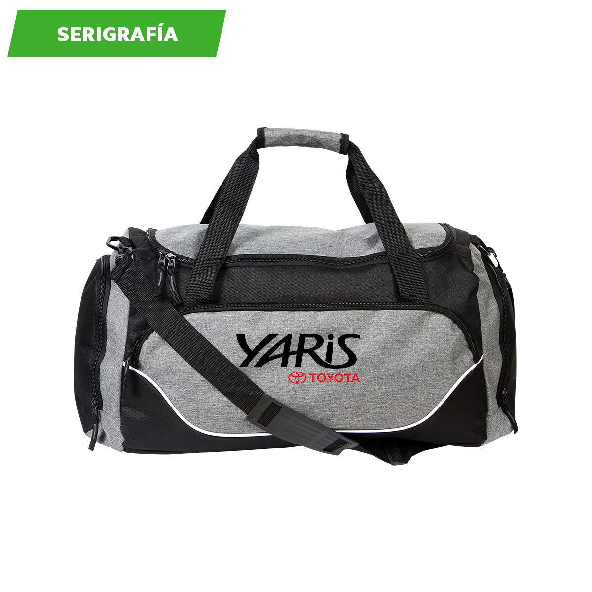 maleta deportiva con detalles negros fabricada en poliéster, con 1 bolsillo frontal, 2 laterales, correa de hombro ajustable y desmontable y agarradera de mano con asa.