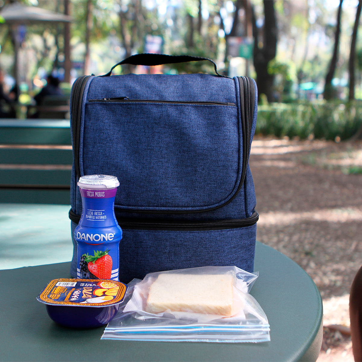 lonchera fabricada en poliéster. cuenta con: compartimento inferior, bolsillo frontal y asa superior.
