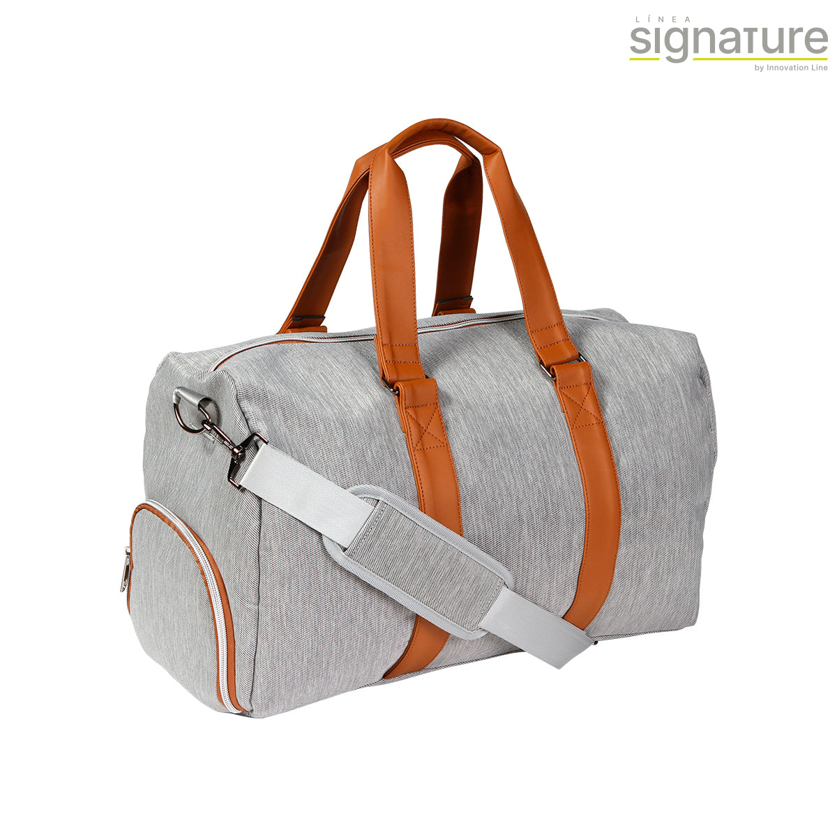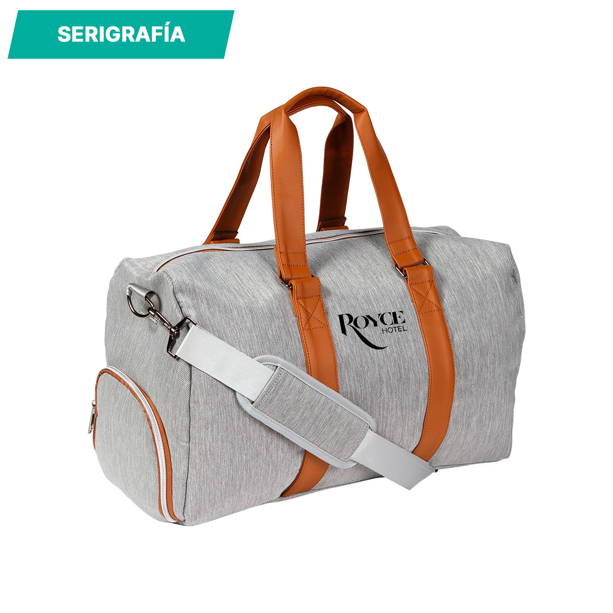 maleta fabricada en poliéster y algodón cationizado, con detalles en curpiel y compartimento para calzado, con asas en la parte superior de curpiel y con correa ajustable acolchonada desmontable.