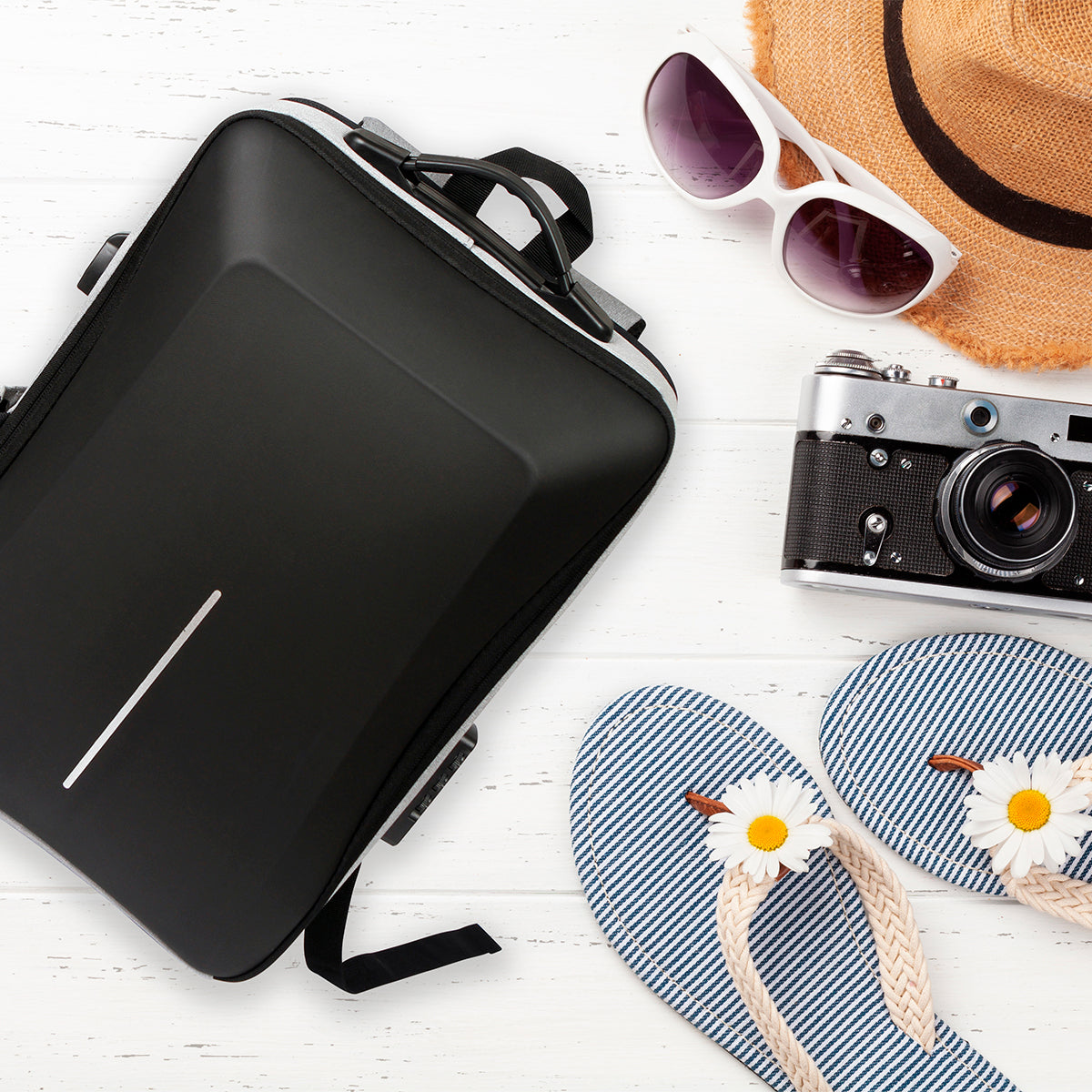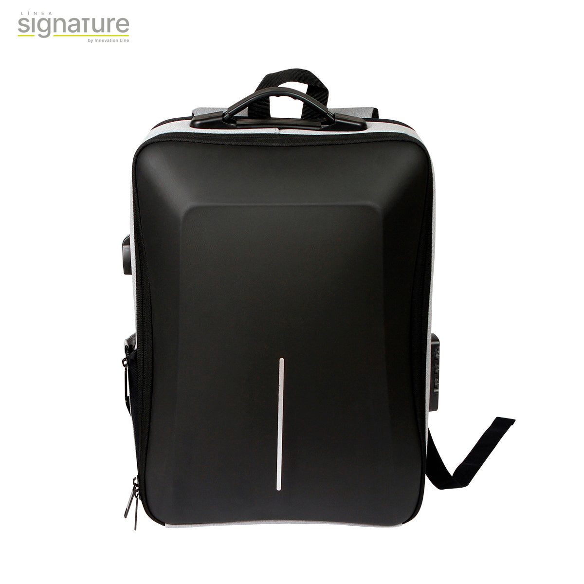 mochila ejecutiva de viaje fabricada en poliéster, con compartimentos para laptop, equipaje y artículos diversos, candado lateral tsa y correas acolchonadas ajustables, con asas en la parte superior, incluye puerto con salida usb.