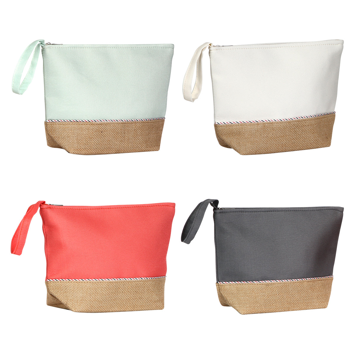 bolsa multiusos / cosmetiquera fabricada con una combinación de poliéster y yute, lo que le confiere durabilidad y resistencia, con correa para llevarla con mas comodidad, cuenta con un tamaño ideal para almacenar todos tus objetos personales.