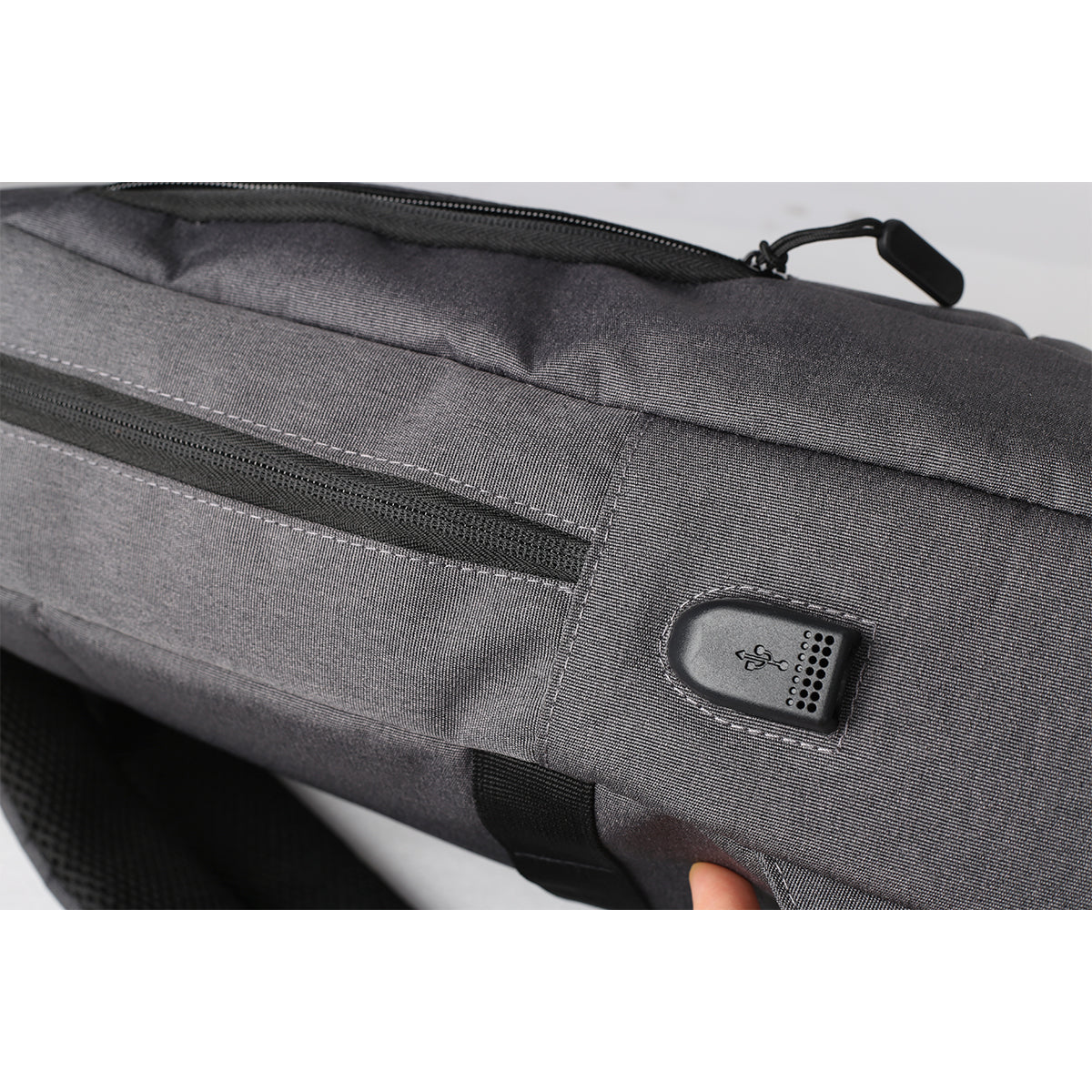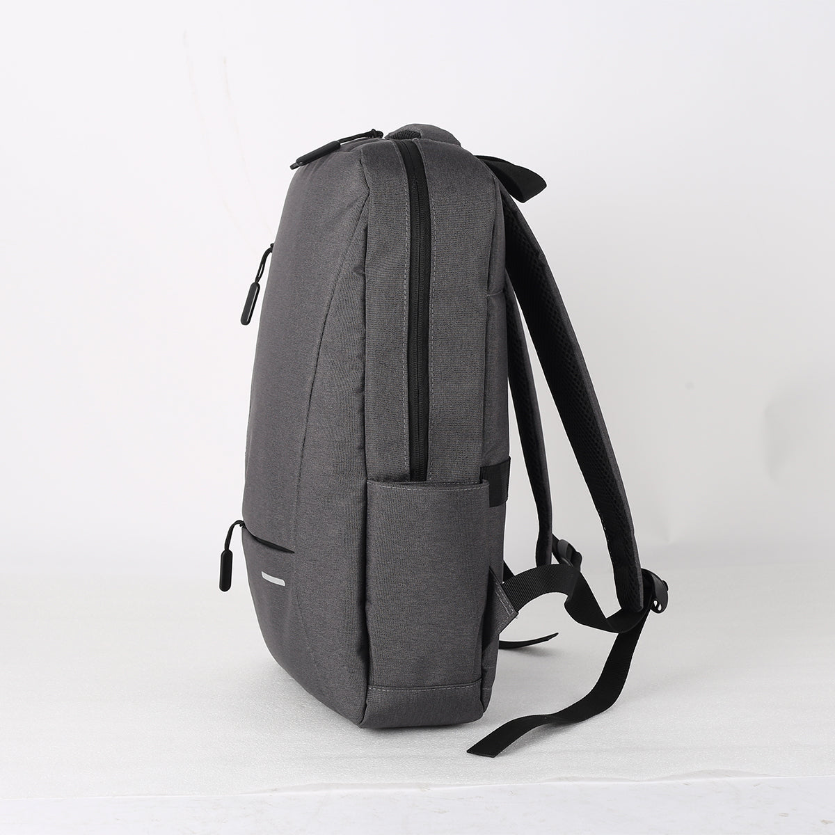 mochila tipo backpack fabricada en poliéster con 2 bolsillos frontales, salida para puerto usb, asa superior y correas acolchadas ajustables, con tira en la parte trasera para facilitar su transporte para viajes.
