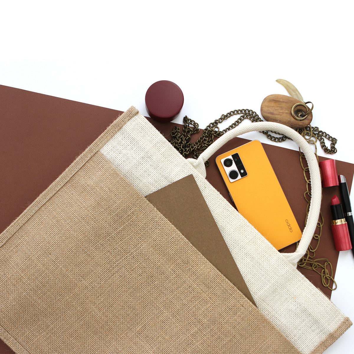 bolsa fabricada en yute, material natural y resistente que le confiere un aspecto rústico y elegante, con asas cómodas que están fabricadas en algodón, con un compartimiento en la parte frontal, para tener los objetos mas pequeños a la mano, con un diseño bi-tono, lo que significa que combina dos tonos complementarios en su diseño.