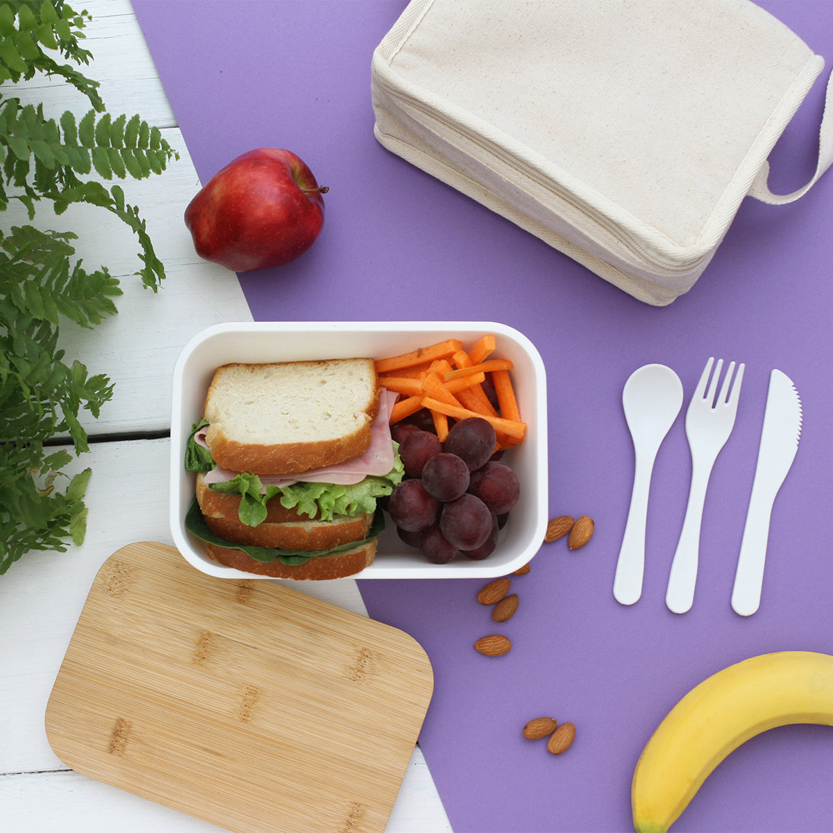 bolsa de algodón térmica con contenedor para alimentos, cubiertos, cierre y correa. nuestra practica lonchera es ideal para mantener tus alimentos y bebidas frescos durante tus actividades al aire libre. su correa ajustable te permite llevarla cómodamente en el hombro o cruzada. incluye un recipiente con acabados de bambú en su interior, cuenta con un resorte sujetador de cubiertos, que te permite asegurar los utensilios y evitar que se muevan o se pierdan durante el transporte. se incluyen cubiertos prácticos y fáciles de limpiar.