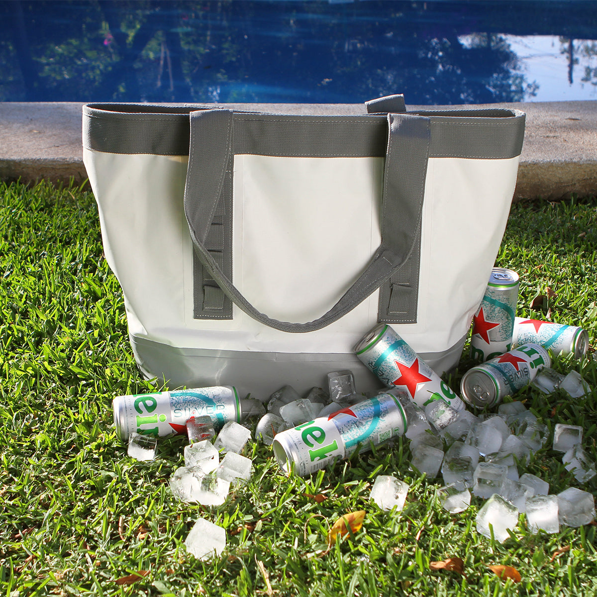 bolsa impermeable con asas. fabricada en pvc y poliéster. es ideal para playa, piscinas o salidas al aire libre, su forro resistente al agua y su amplio tamaño permite que se utilice como hielera y puedas llevar tus bebidas favoritas a cualquier lado.