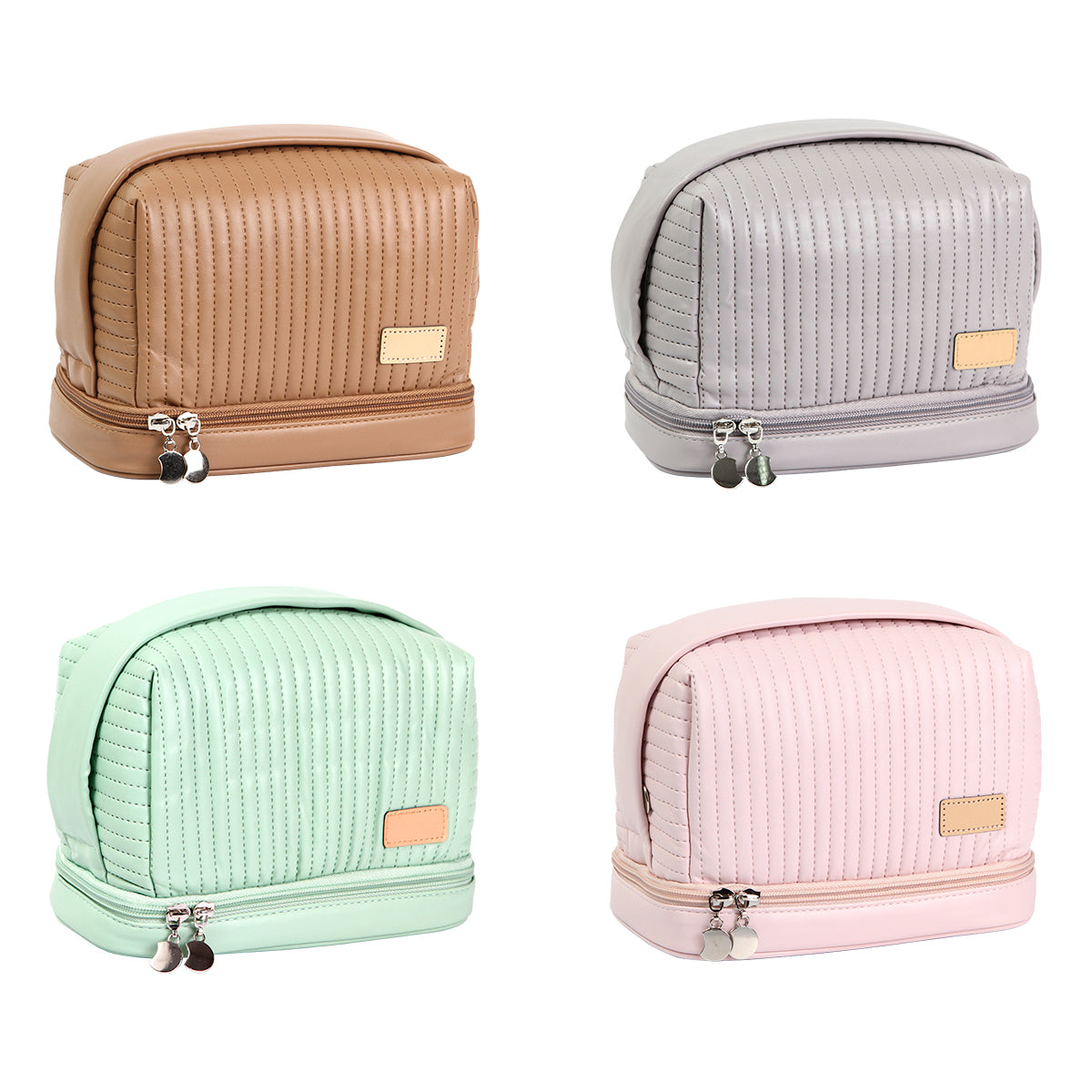 bolsa de cosméticos fabricada en curpiel y poliéster. con tacto crema y asa, dos bolsillos con cremallera, uno impermeable con forro de acetato de vinilo y polietileno (peva). diseño semicircular con rayas.