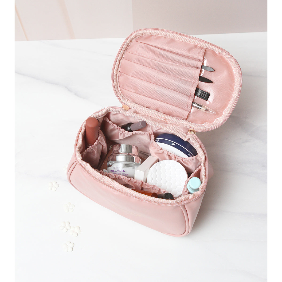 bolsa cosmetiquera fabricada en cuero sintético (pu) y pvc, con forro elaborado en nailon, detalle metálico en cierre, contiene 6 compartimentos en el interior para cosméticos y bolsillos internos para brochas con protección para no manchar la parte interna.