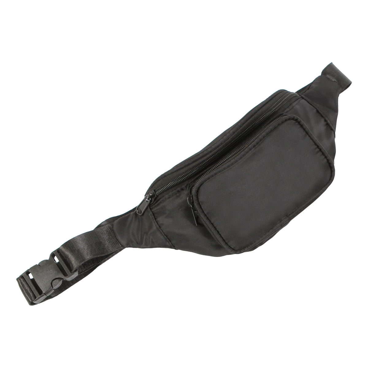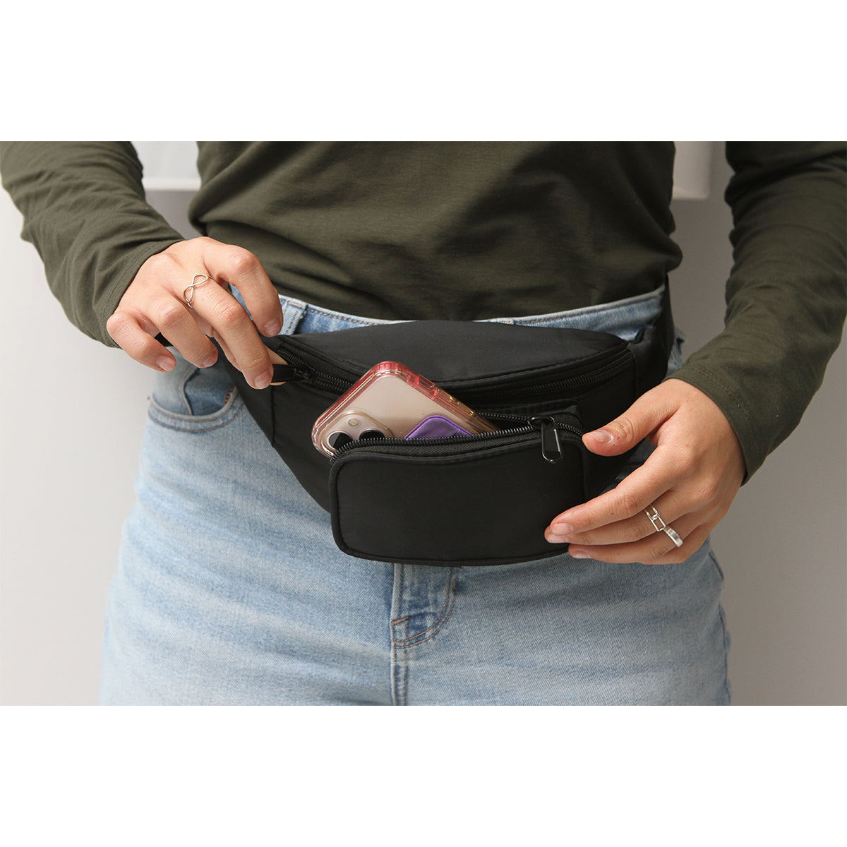 bolsa tipo cangurera fabricada en nailon, con tres compartimentos con cierre, ideales para guardar artículos pequeños como audífonos, celular, monedas, lentes, etc.