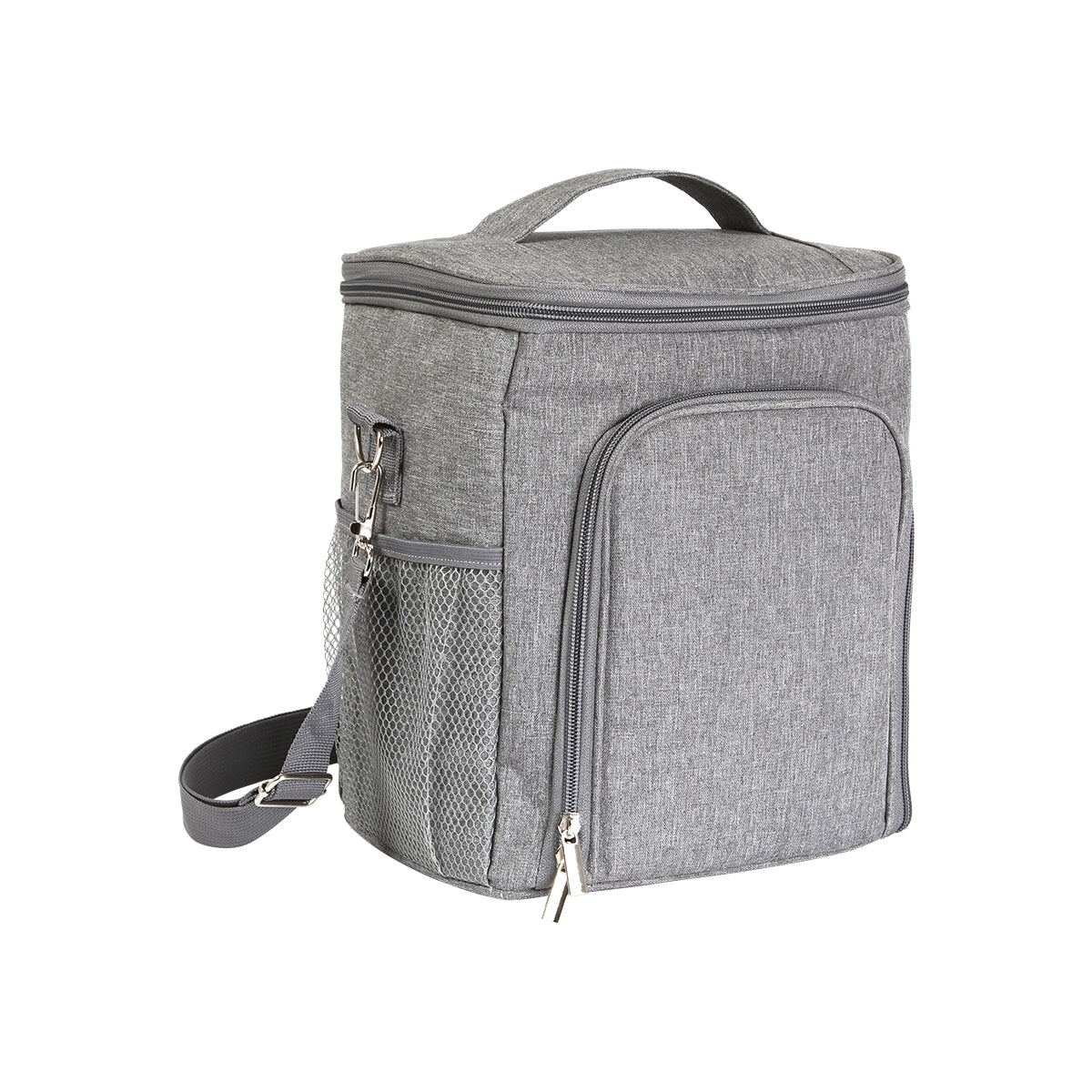 hielera fabricada en lona, espuma de pe, forro de acetato de vinilo y polietileno (peva). cuenta con doble cierre, bolsas laterales tipo red, asa y correa de hombro.