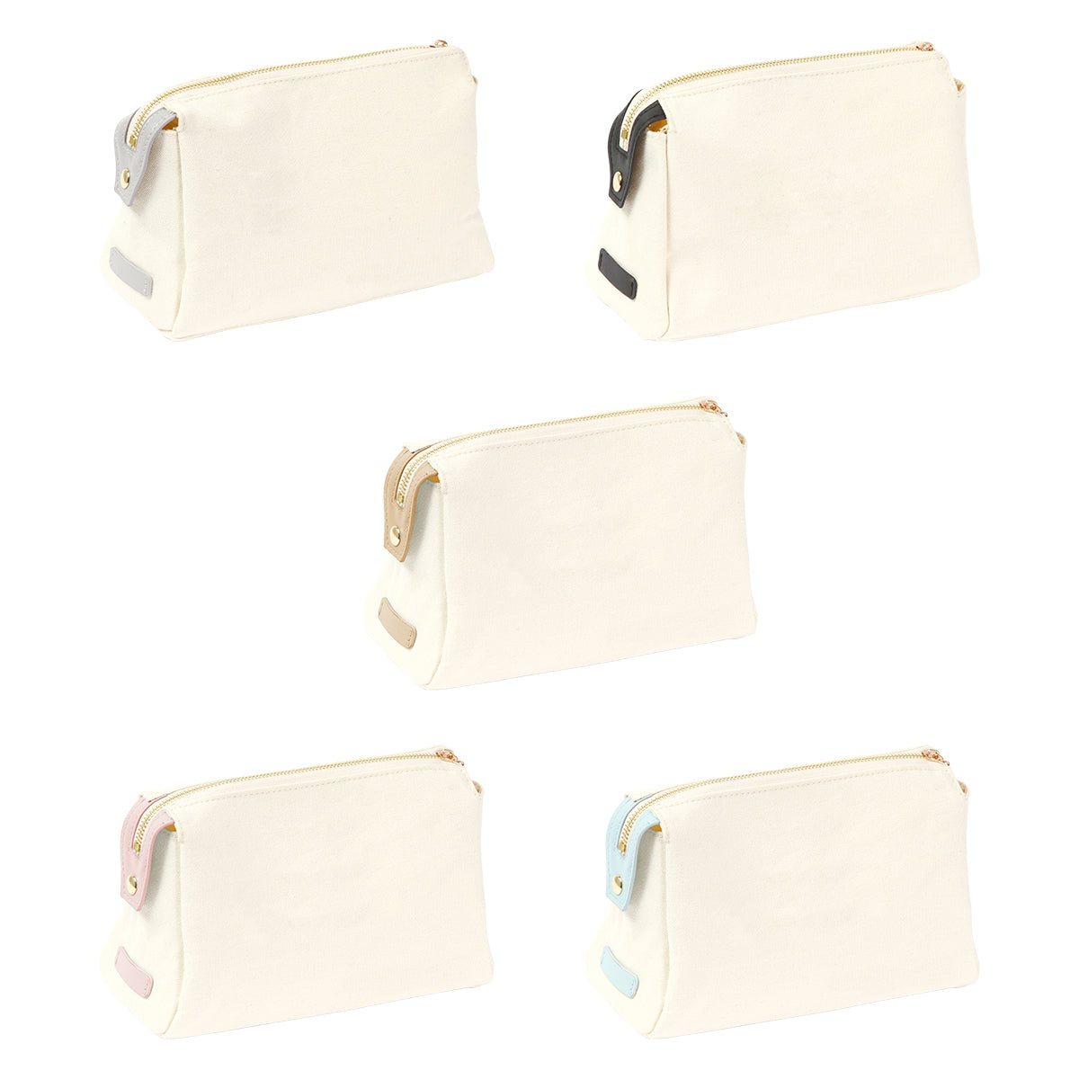cosmetiquera fabricada en lona de algodón y poliéster, con detalles a color fabricados en curpiel, con cierre metálico. un compartimento principal.