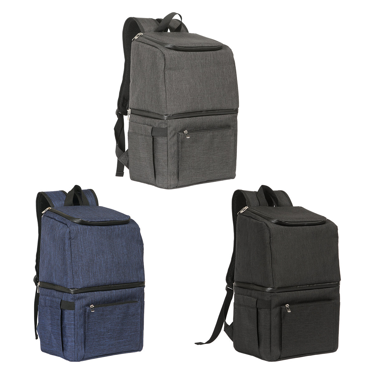 hielera tipo backpack fabricada en poliéster. incluye: bolsillo frontal con cremallera. dos bolsillos laterales abiertos con banda elástica. bolsillo principal con cremallera. forro interior de peva impermeable. un bolsillo con cremallera en la parte superior. parte trasera de malla sándwich. un abridor de botellas en la correa trasera.