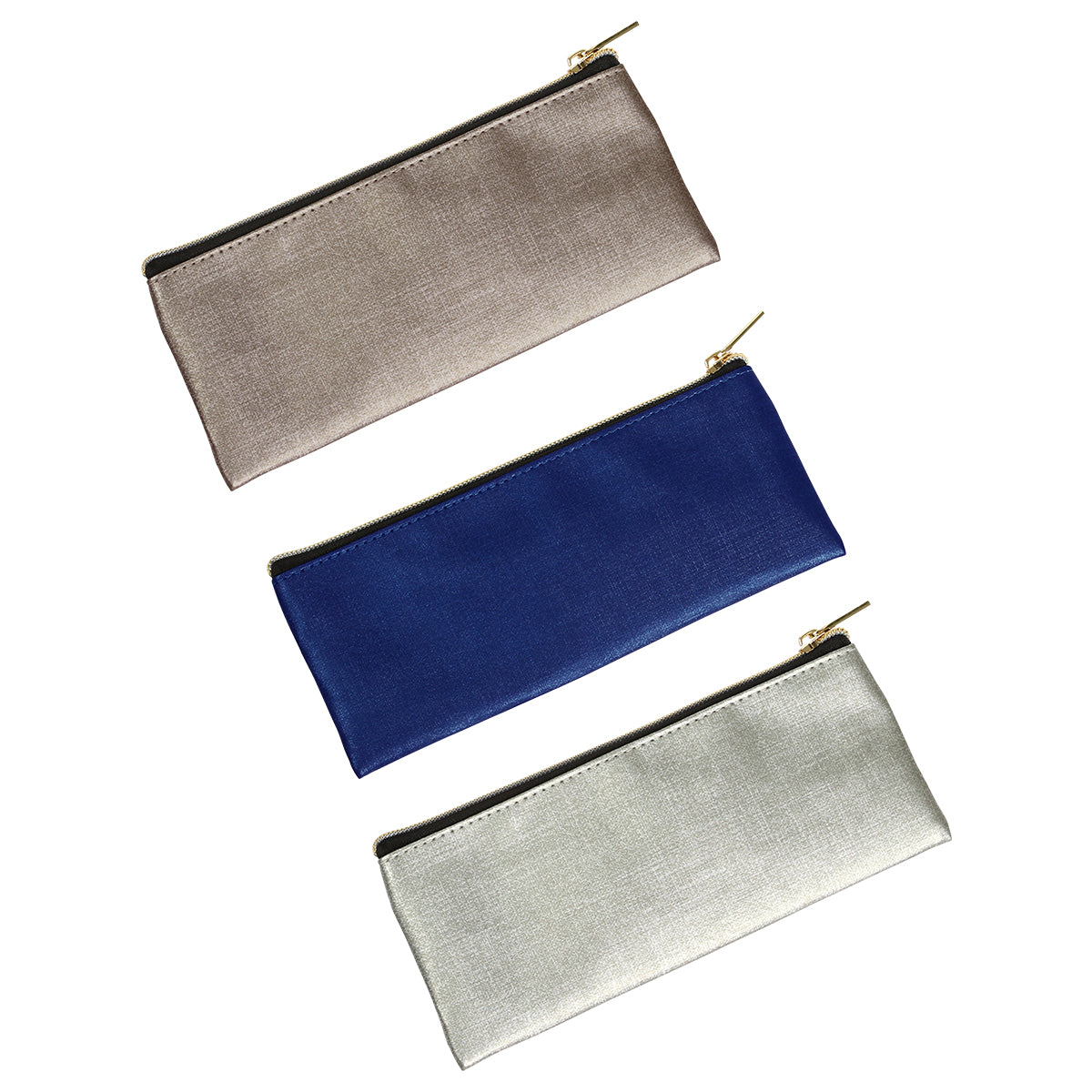 estuchera fabricada en poliéster reciclado y curpiel. con cierre color dorado.