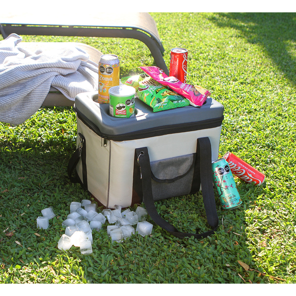 hielera para alimentos fabricada en poliéster, nylon y eva. cuenta con destapador metálico, correas ajustables para su fácil y mejor transportación. además en la parte superior de la tapa cuenta con cuatro espacios fabricados en eva para colocar bebidas, este material le da más firmeza para evitar que se derramen los líquidos.