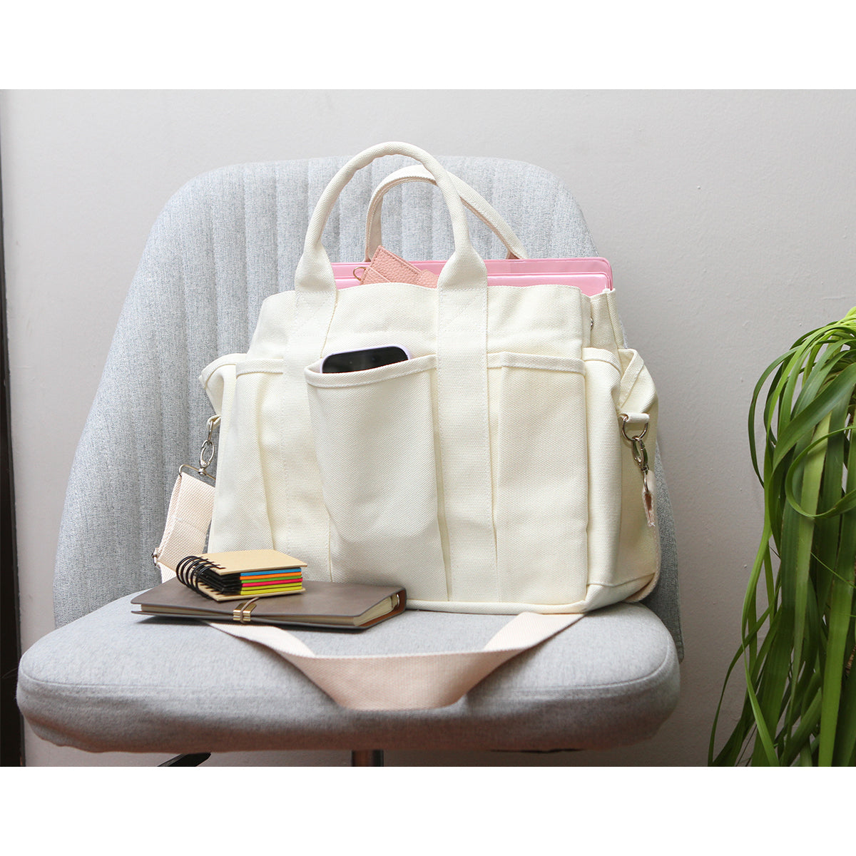 bolsa fabricada en lona de algodón, conocida también como canvas, material resistente y fácil de lavar. esta bolsa cuenta con dos asas firmes para usarla como bolsa de mano y con un asa ajustable para usarla como bolsa al hombro. cuenta con bolsas externas sin cierres para guardar objetos más pequeños y tener fácil acceso a ellos.