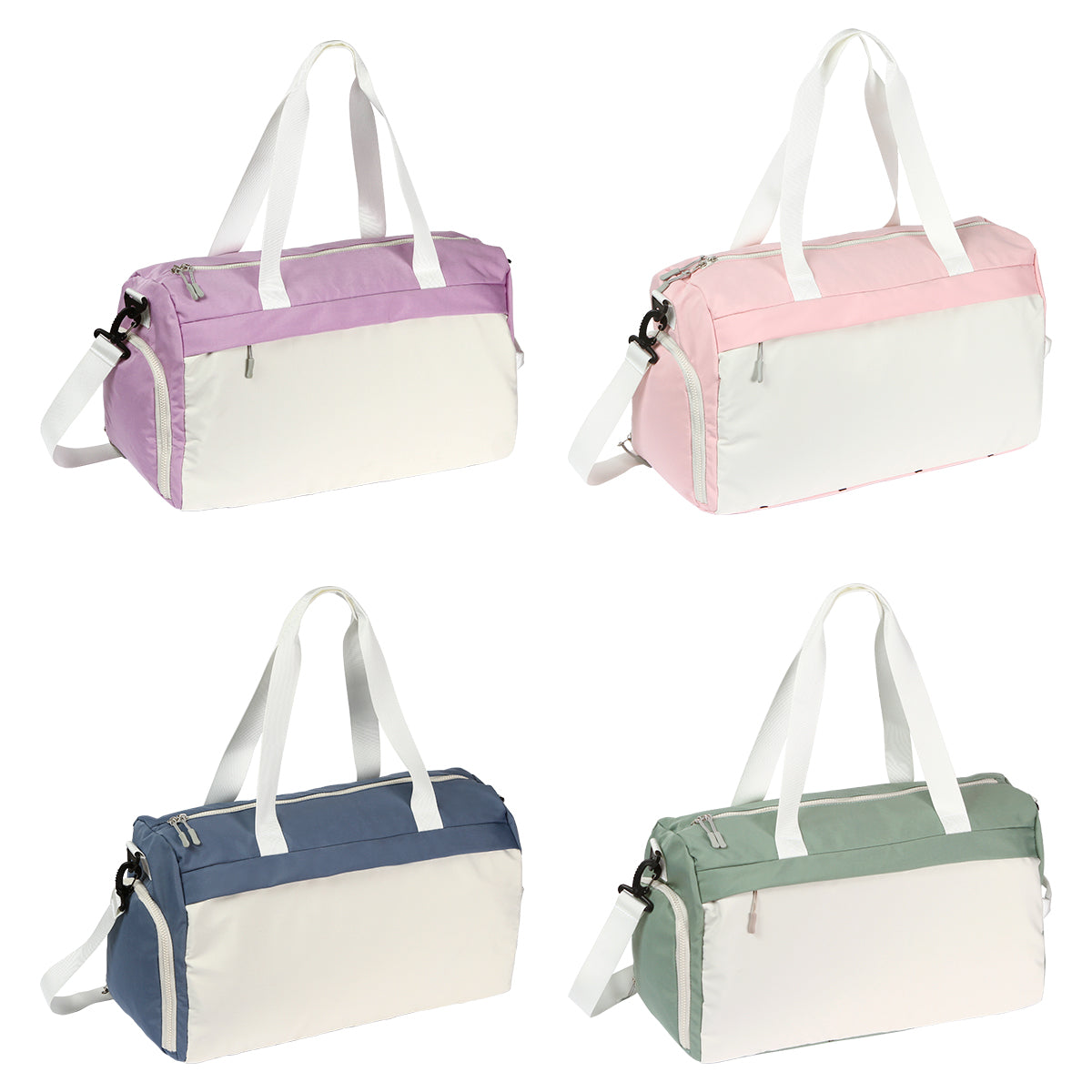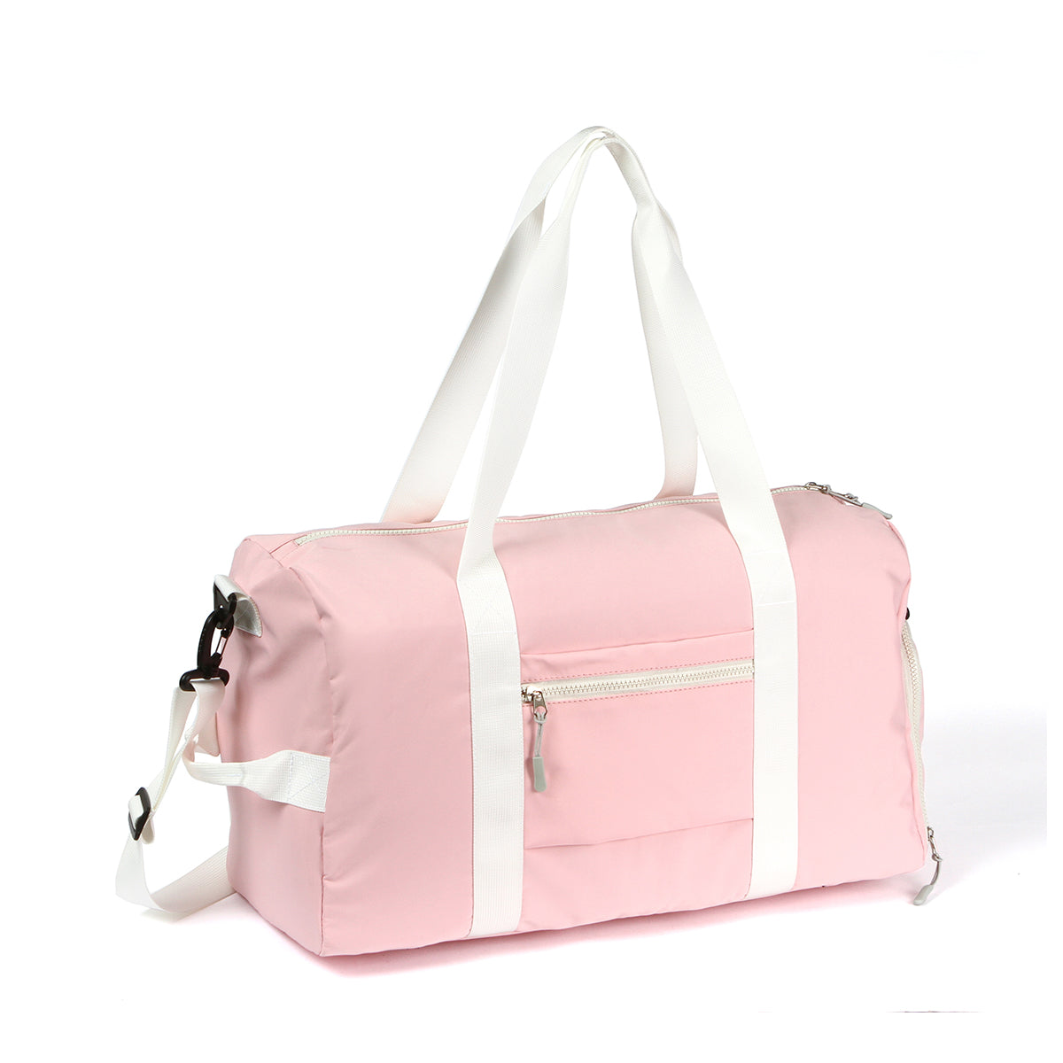 maleta fabricada en poliéster, con bolsillo para zapatos en colores llamativos, con dos asas superiores y un asa lateral para mejor manejo.