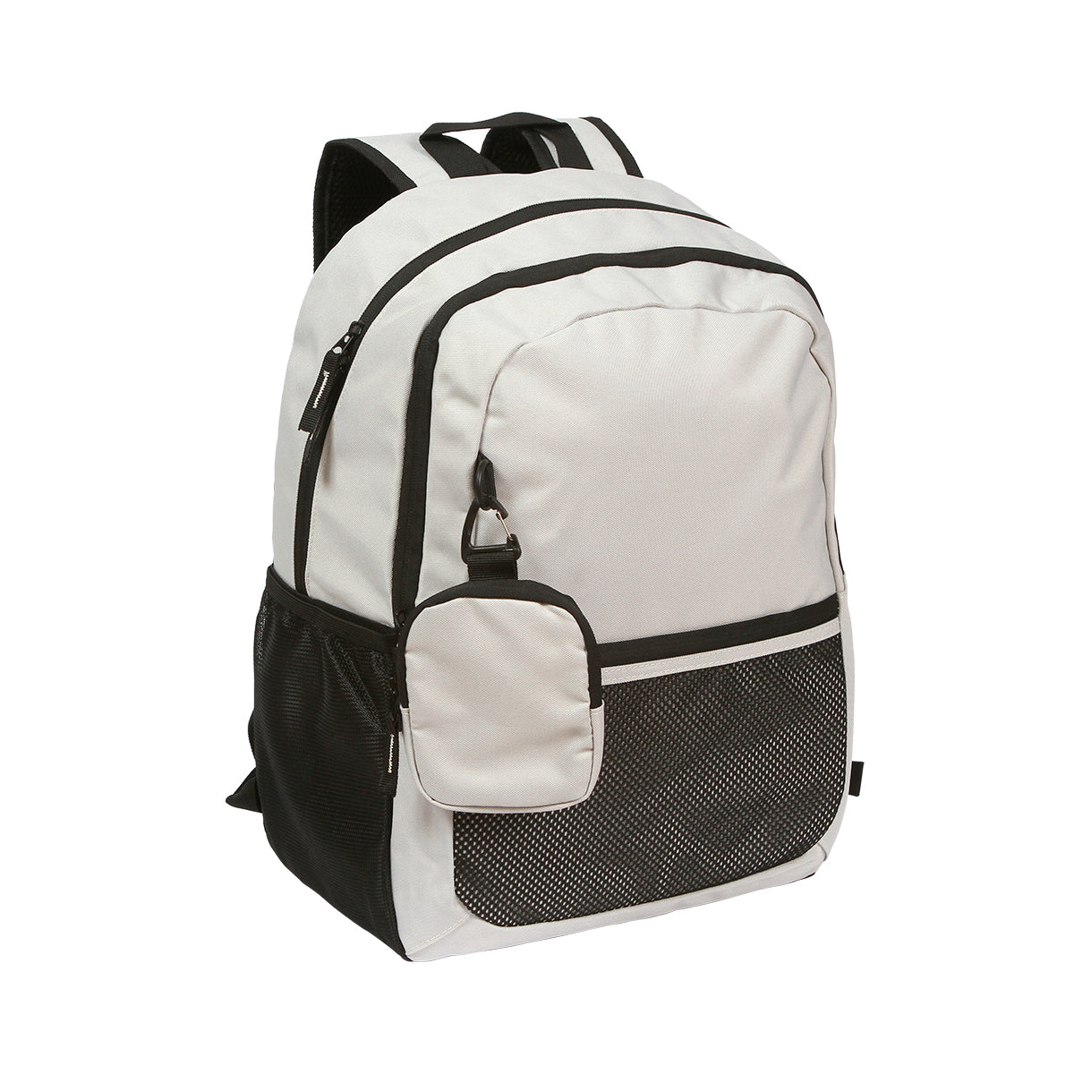 mochila fabricada en poliéster, con dos compartimentos principales con cierre y un compartimento delantero en malla con cierre, para tener a la vista tus objetos. incluye dos compartimentos laterales más pequeños con resorte para guardar articulos. y una bolsita individual de menor tamaño con cierre, esta cuenta con un seguro para colgarla en la misma mochila. cuenta también con dos correas ajustables y acolchonadas para que se adapte perfecto a tus hombros.