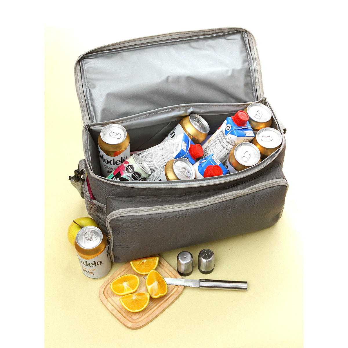 hielera con set bbq de 10 piezas, es un conjunto de herramientas esenciales para la parrilla, fabricadas en acero inoxidable de alta calidad. incluye una tabla para picar de madera, 1 pimentero, 1 salero ambos con tapa, una espátula tipo grill, un tenedor grill, una pinza grill, un cuchillo para cortes, tenedor para carne y un abre botellas, junto con una hielera fabricada en poliester resistente para transportar y almacenar las herramientas de manera segura.