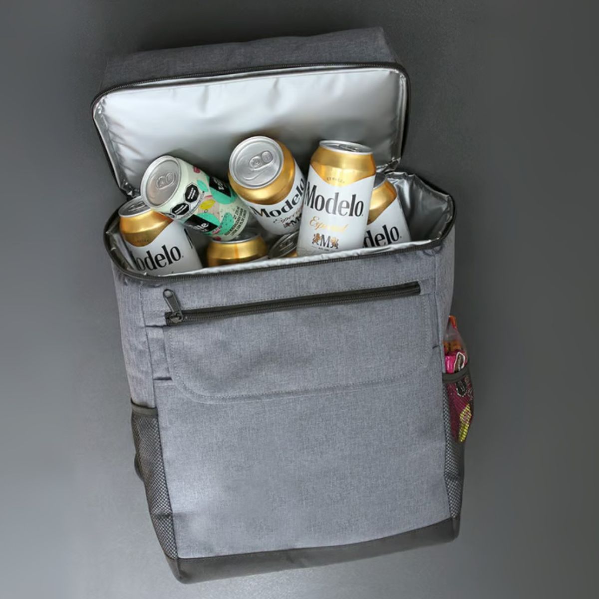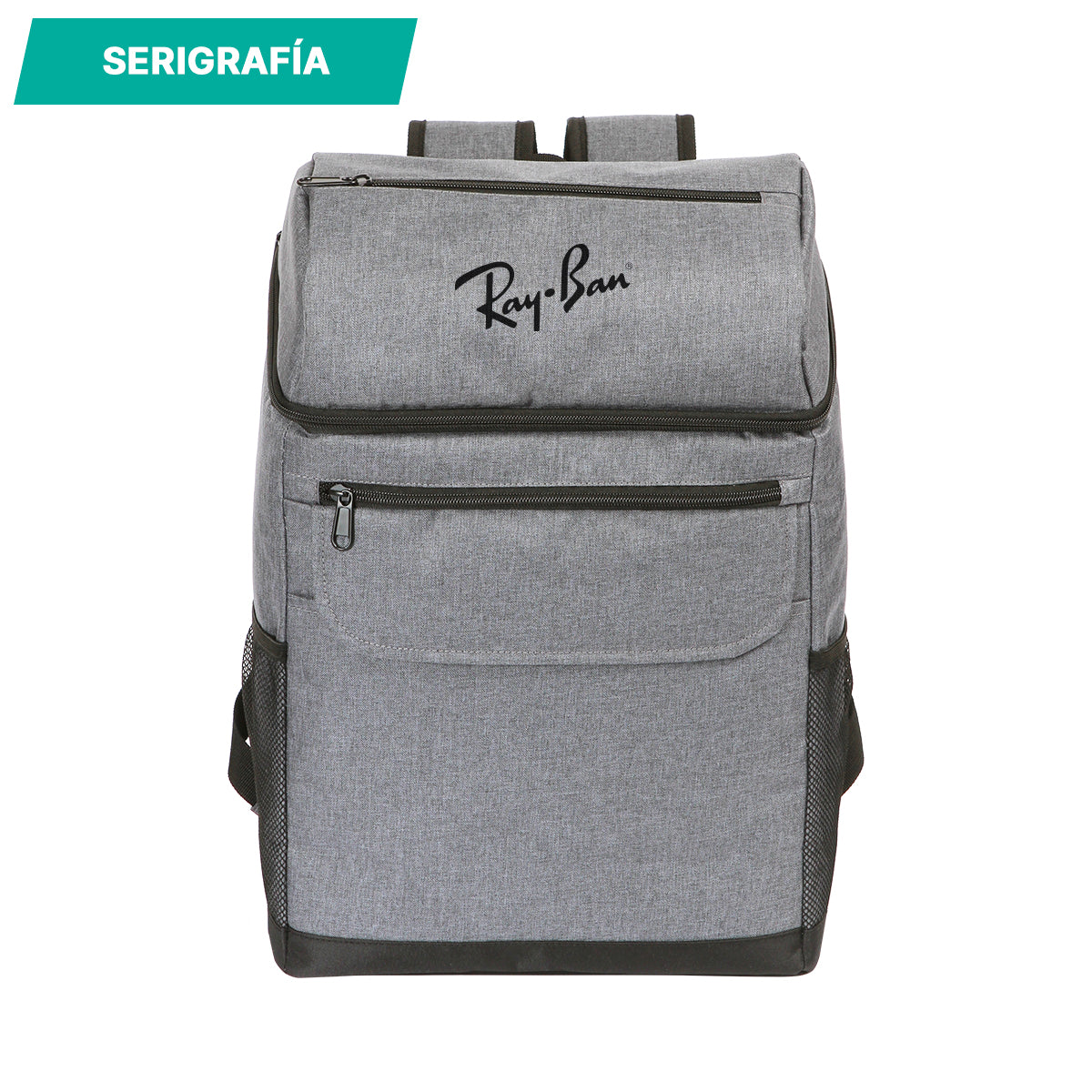 hielera tipo mochila fabricada en poliéster. incluye un compartimento principal con cremallera, bolsillo frontal pequeño con cremallera, dos bolsillos laterales de tela tipo mesh, un bolsillo superior con cremallera y dos tiradores.