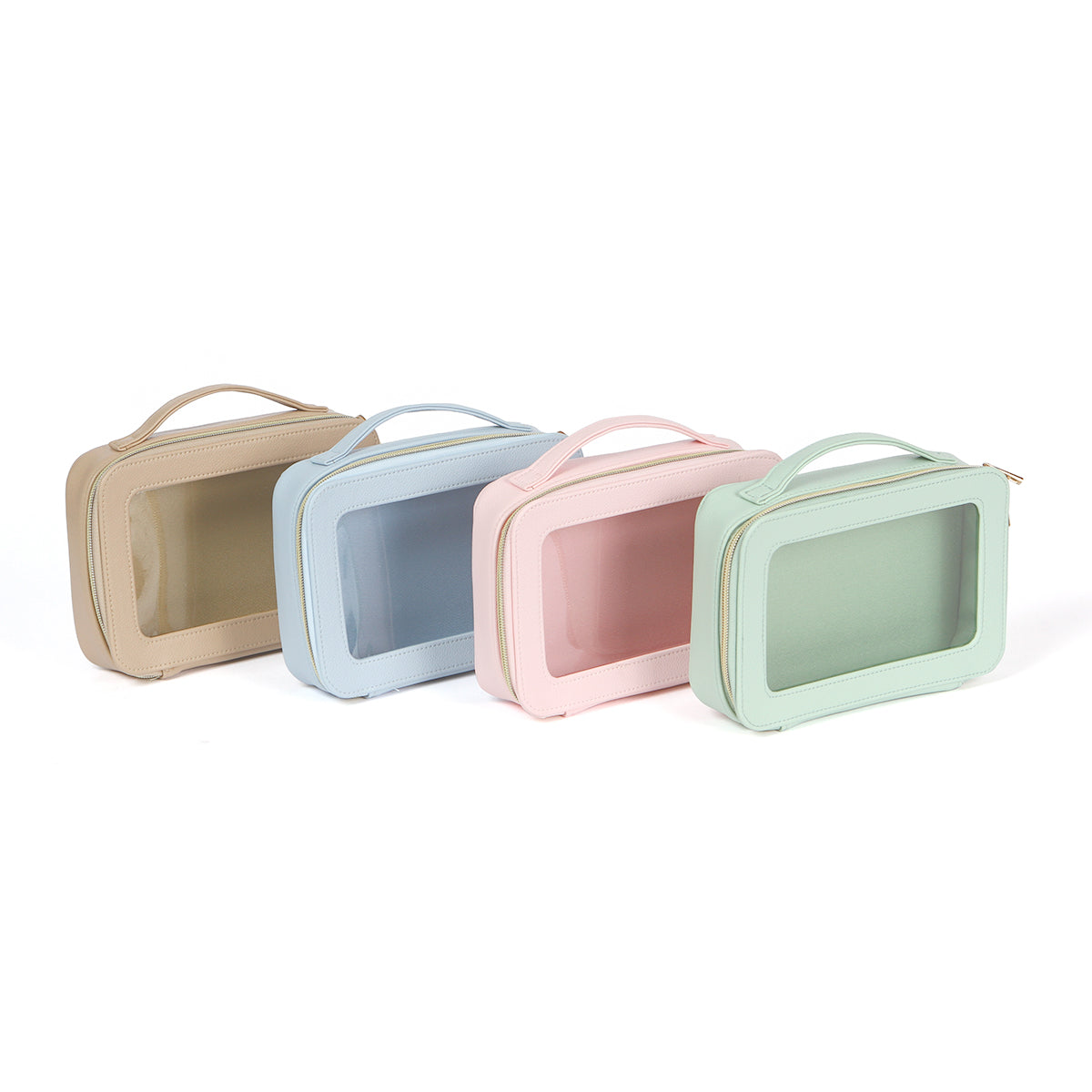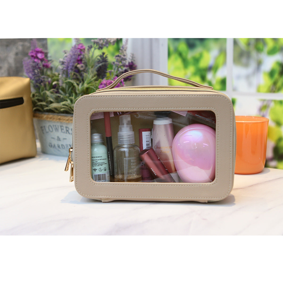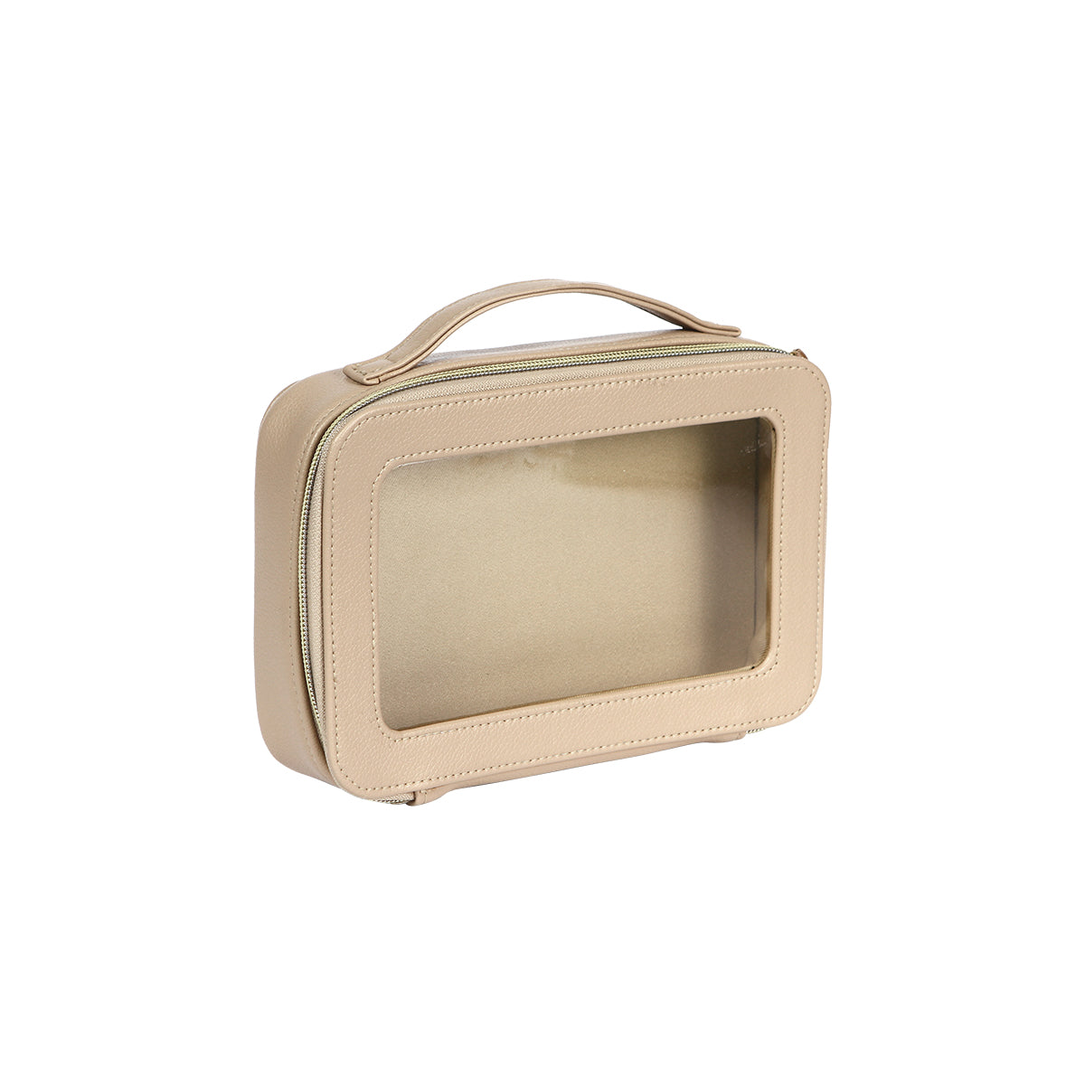 cosmetiquera fabricada en curpiel con ventana traslúcida fabricada en plástico tipo pvc. compartimento principal con cierre metálico. cuenta con un asa en la parte superior para una mejor manipulación y traslado.