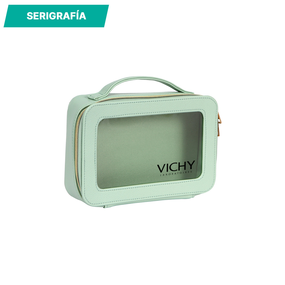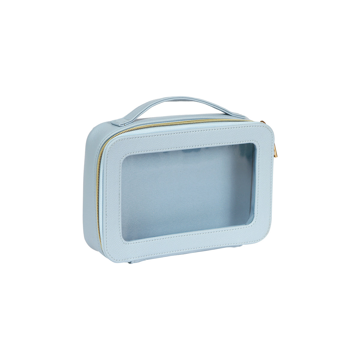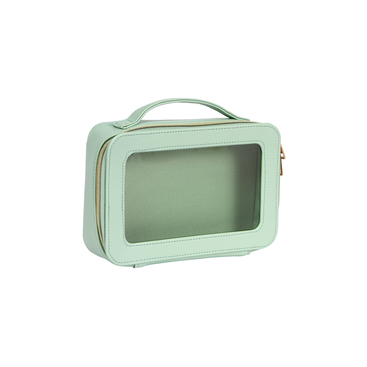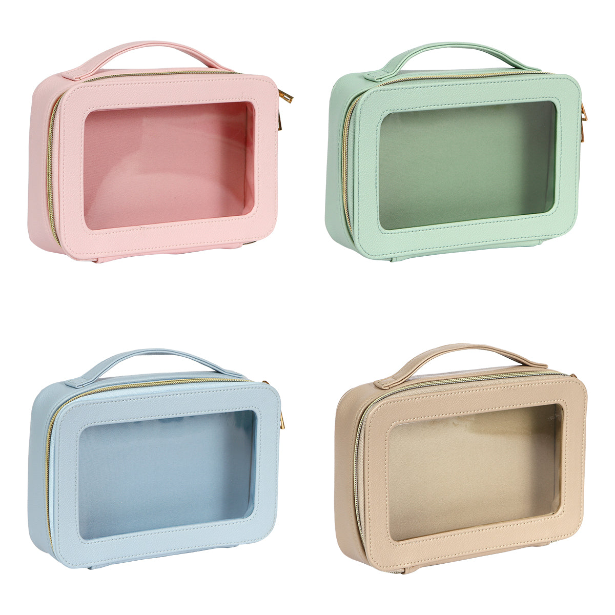 cosmetiquera fabricada en curpiel con ventana traslúcida fabricada en plástico tipo pvc. compartimento principal con cierre metálico. cuenta con un asa en la parte superior para una mejor manipulación y traslado.