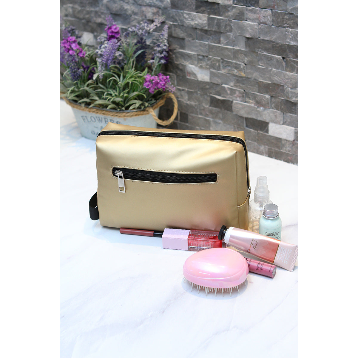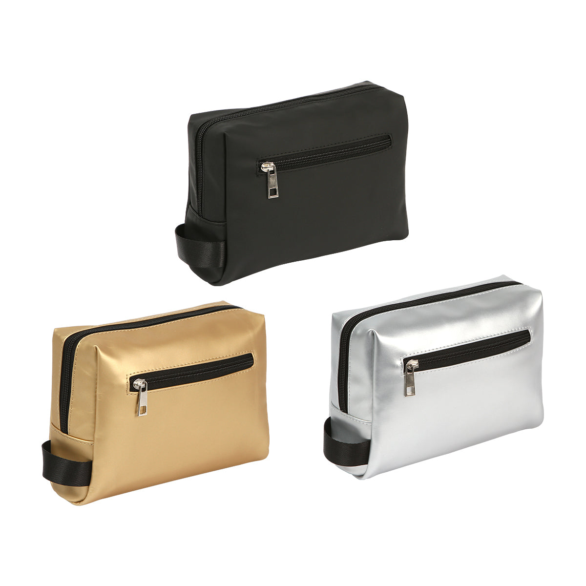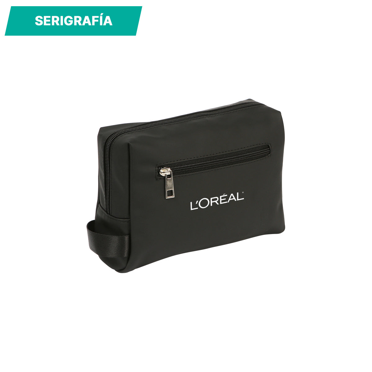 cosmetiquera fabricada en curpiel y forro de poliéster. cuenta con un compartimento principal con cierre, dentro de este cuenta con una pequeña bolsa. también tiene en un pequeño bolso con cierre en la parte de atrás.