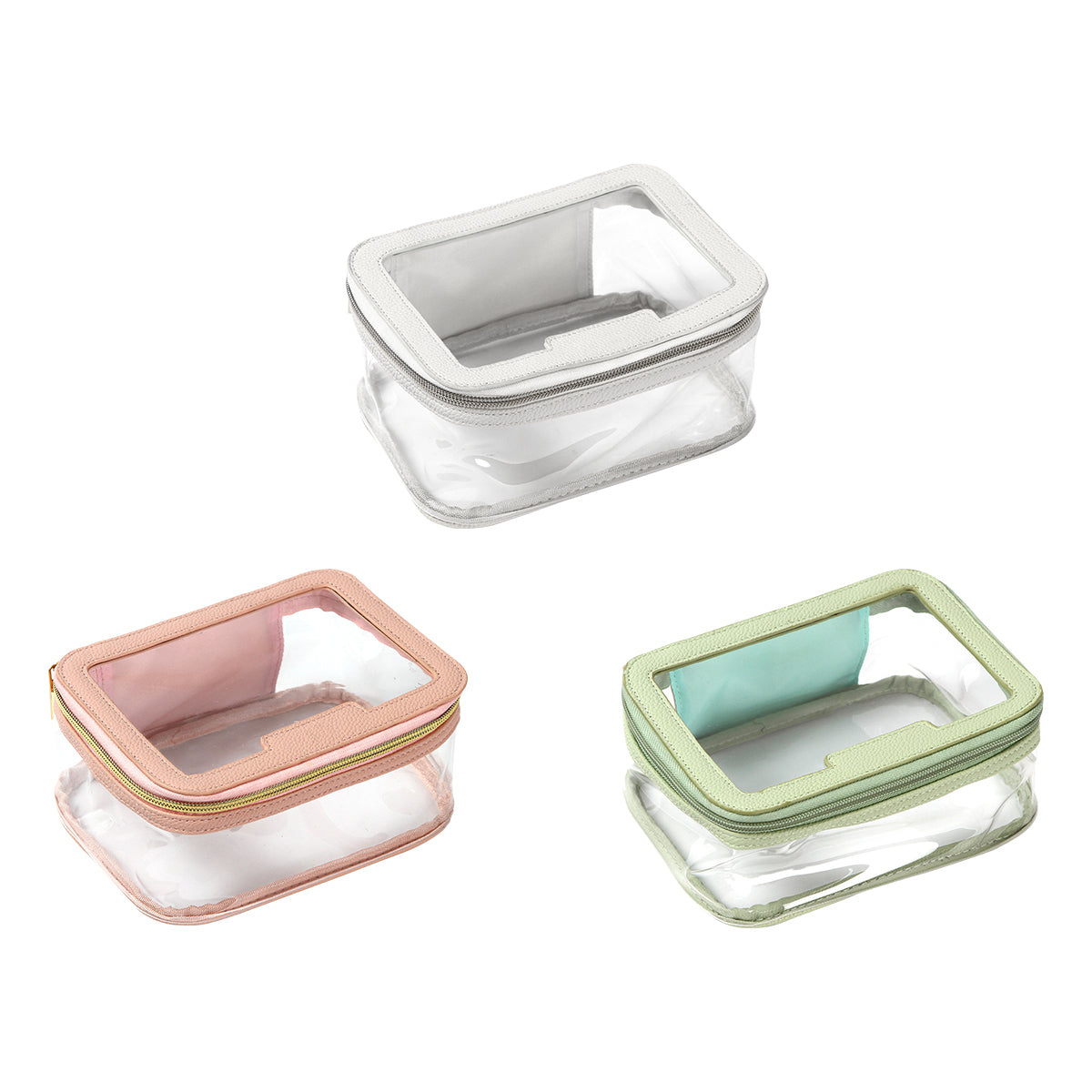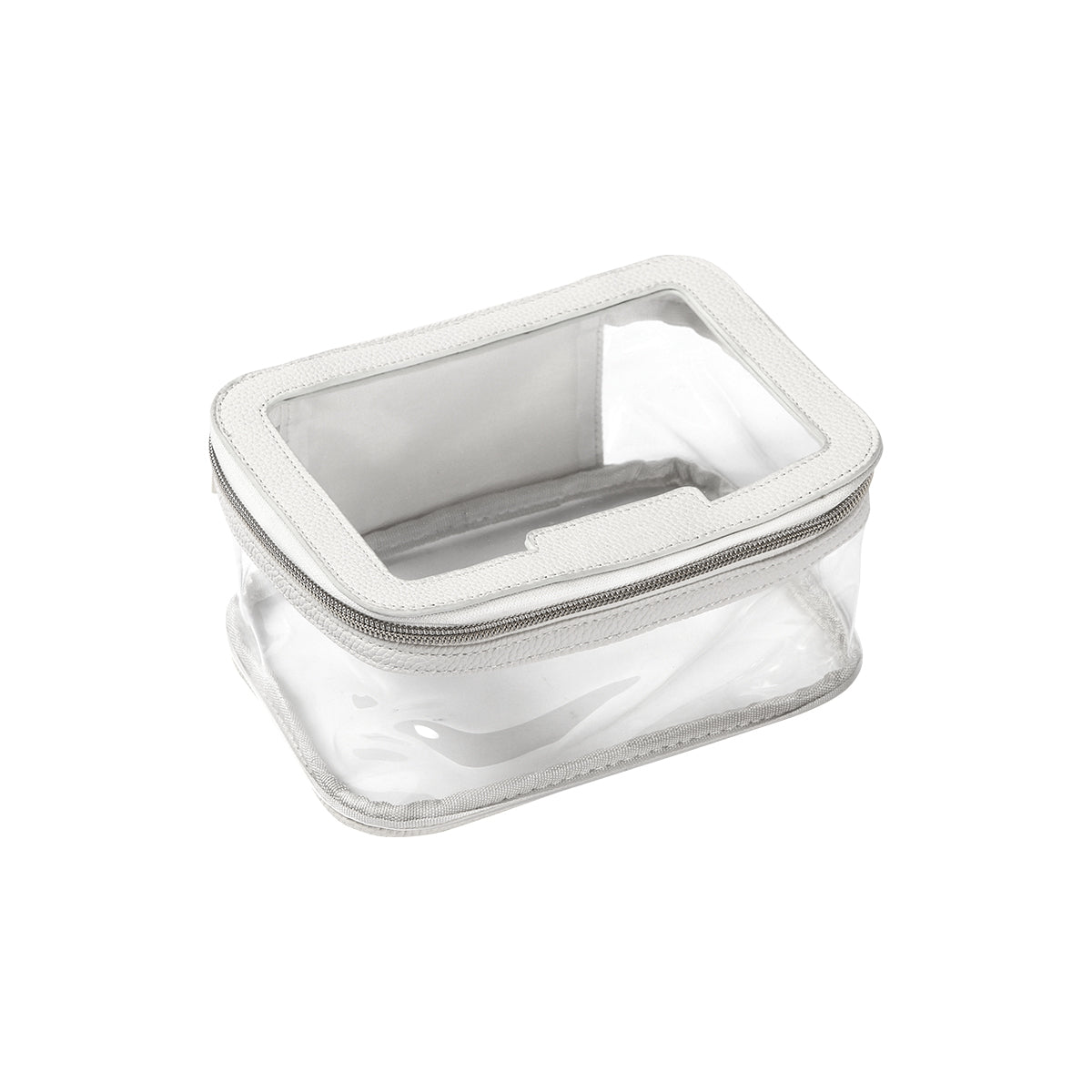 cosmetiquera fabricada en plástico pvc traslúcida con detalles en pu. con un compartimento principal con cierre metálico. diseñada para organizar productos cosméticos y otros de cuidado personal, como cremas, maquillaje, cepillos, etc. su ventana transparente ayuda a tener una mejor visibilidad de dichos artículos."