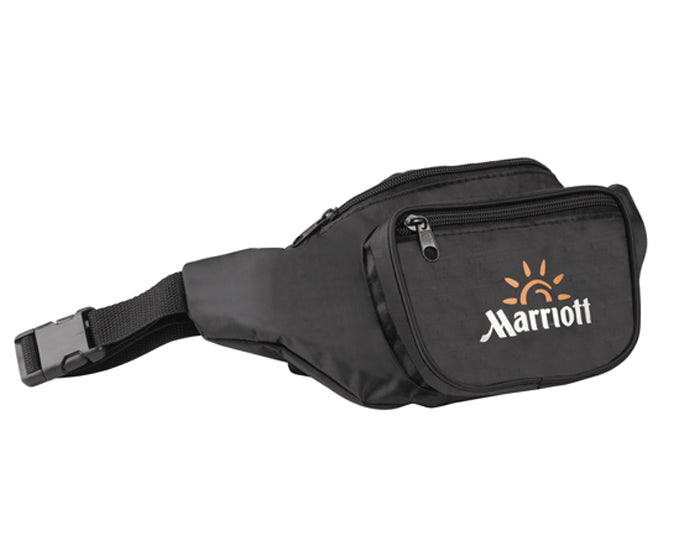 cangurera con 2 compartimentos, bolsa con cierre al frente, cinta ajustable a la cintura con broche a presión.