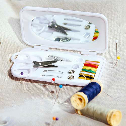 incluye botones, ensartador de aguja, tijeras, hilo, agujas, seguros y estuche con espejo. este producto por ser últimas piezas puede presentar alguna variación, no se aceptan devoluciones.