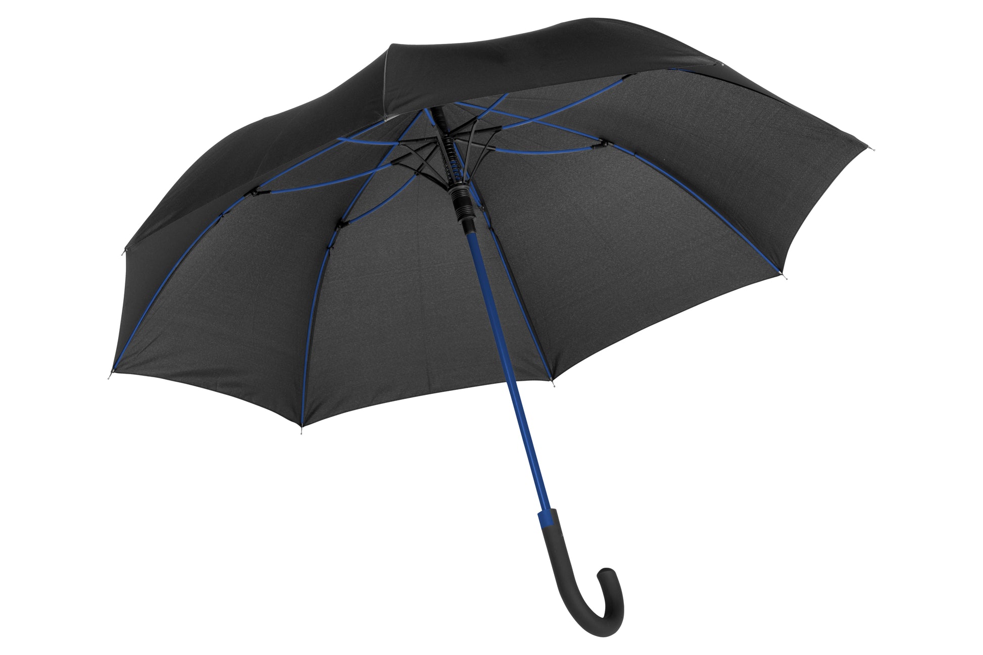 Ø 103 cm. poliéster pongee. paraguas apertura automática. eje de metal y varillas de fibra de vidrio de color, puntas metálicas. mango curvo de goma con botón de color. cierre con correa de velcro.
