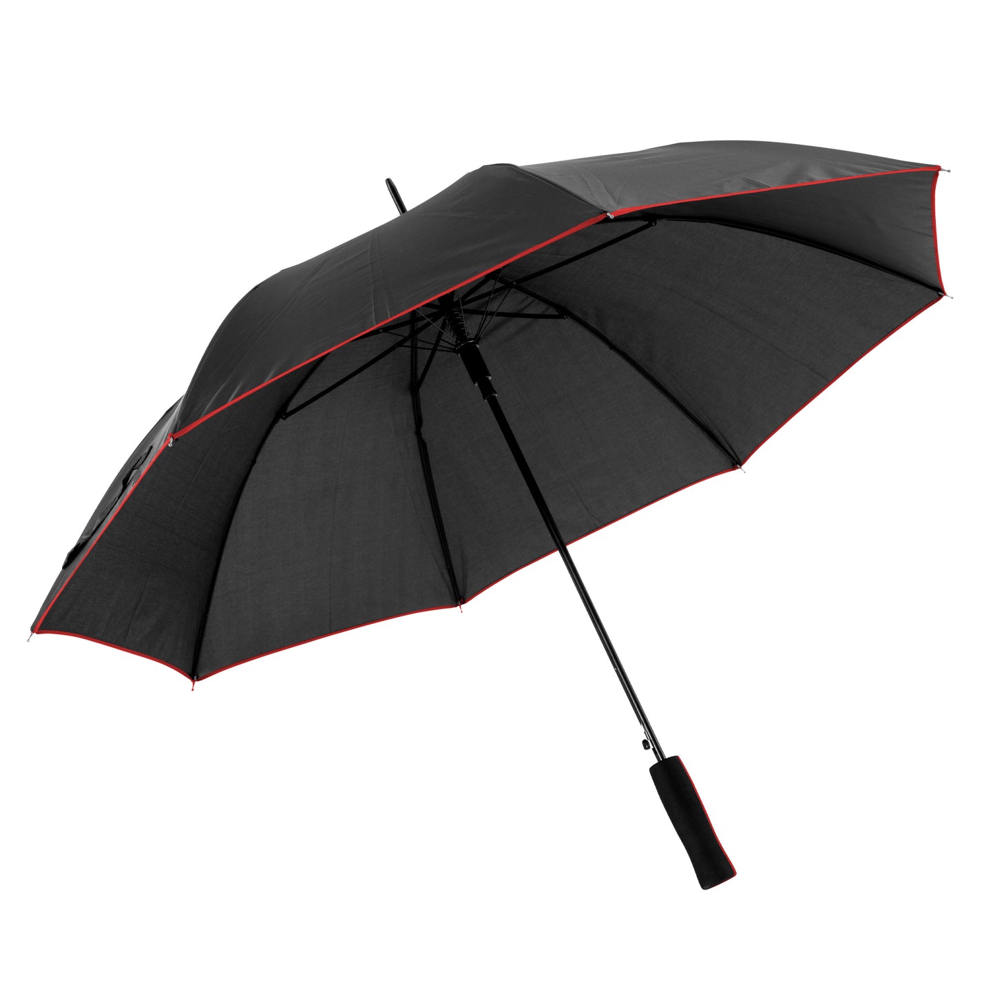 mantente seco y elegante.paraguas apertura automática y cierre manual. eje y varillas metálicas. tela negra con detalle de color. mango de goma eva de doble color. botón a presión. cierre con correa de velcro.