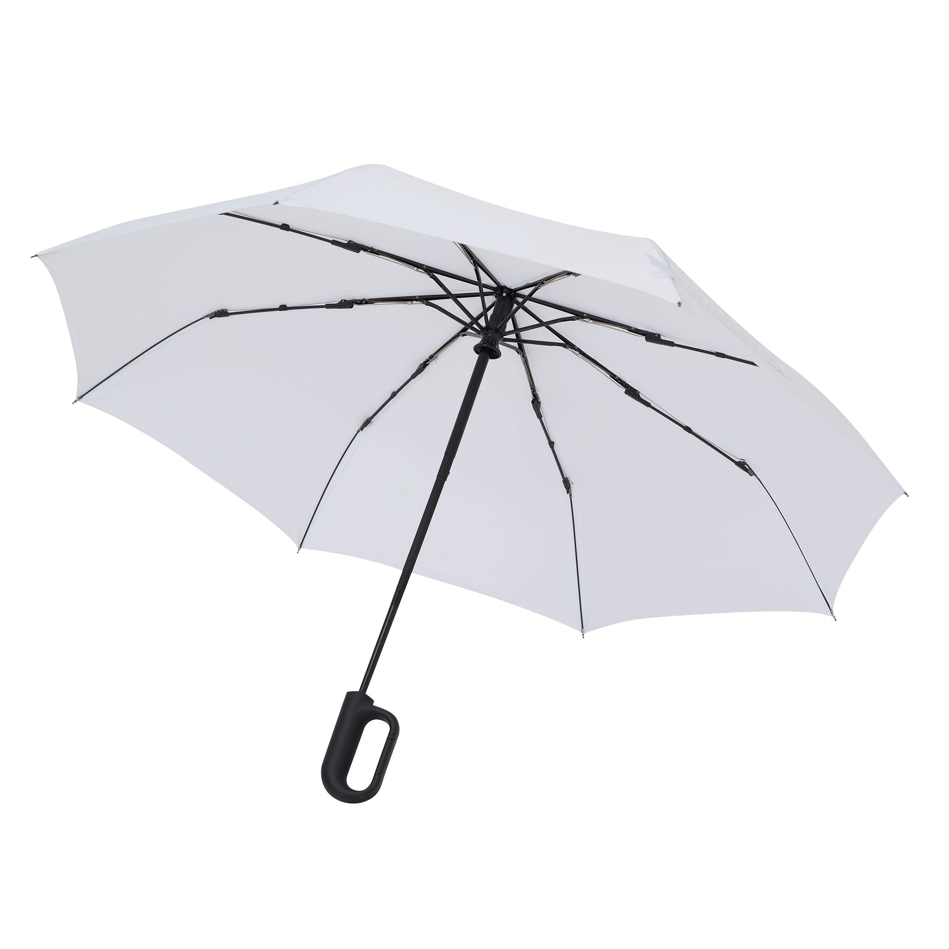 protección inmediata en un clicparaguas apertura y cierre automatico. eje y varillas metálicas. mango con asa y sistema mosquetón, de plástico engomado color negro mate. botón a presión. cierre con correa de velcro.