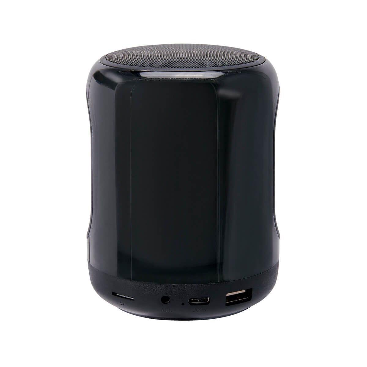 bocina bluetooth recargable con luz rgb ajustable a 10 efectos diferentes. reproducción de música 4 hrs aproximadamente. rango de conexión 10 metros. cuenta con puerto para tarjeta tf, puerto usb, puerto auxiliar 3.5 mm y puerto tipo c. radio fm. incluye cable cargador usb.